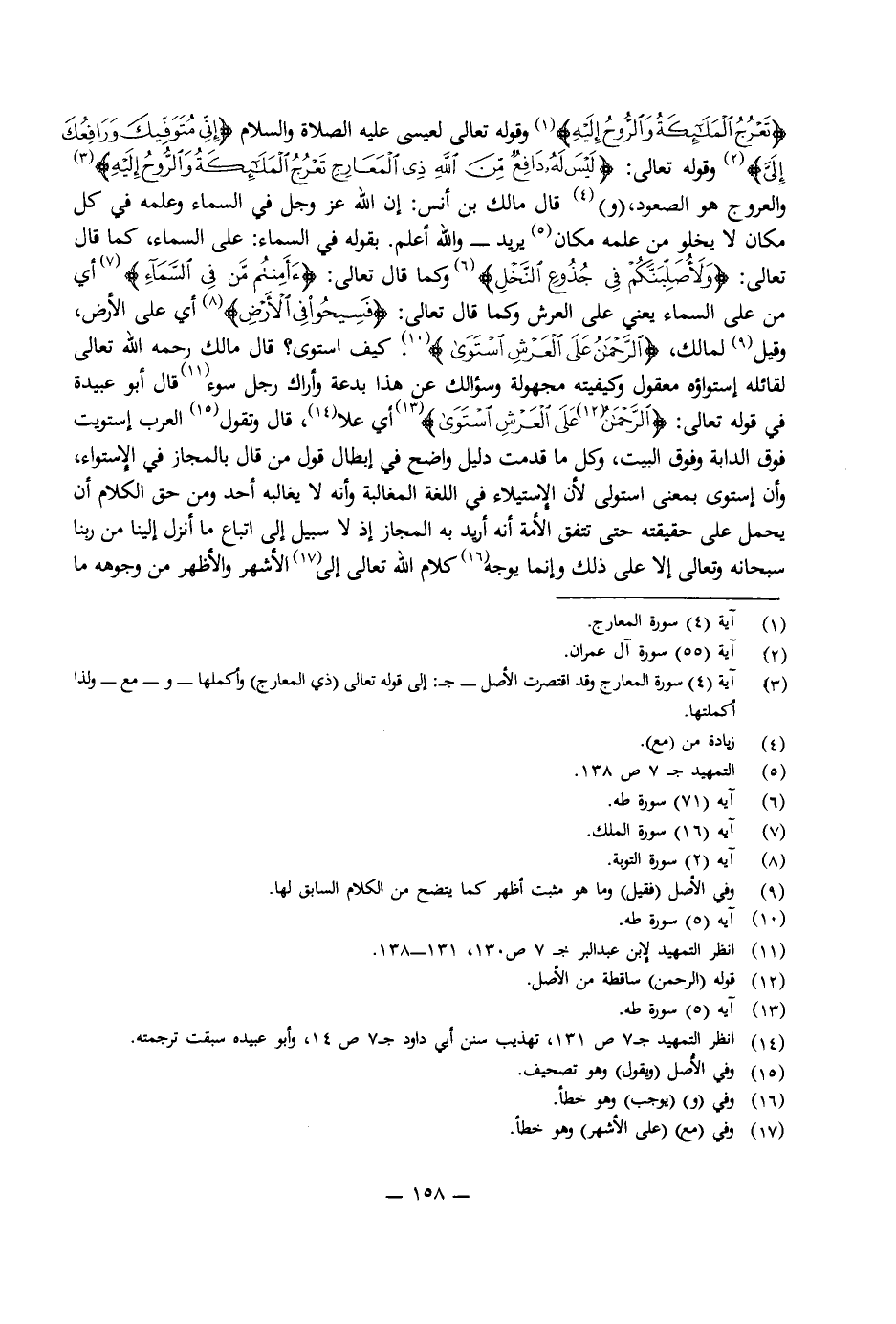 {تَعْرُجُ الْمَلَائِكَةُ وَالرُّوحُ إِلَيْهِ} [المعارج: 4] وَقَوْلُهُ تَعَالَى لِعِيسَى عَلَيْهِ الصَّلَاةُ وَالسَّلَامُ: {إِنِّي مُتَوَفِّيكَ وَرَافِعُكَ إِلَيَّ} [آل عمران: 55] وَقَوْلُهُ تَعَالَى: {لَيْسَ لَهُ دَافِعٌ - مِنَ اللَّهِ ذِي الْمَعَارِجِ - تَعْرُجُ الْمَلَائِكَةُ وَالرُّوحُ إِلَيْهِ} [المعارج: 2 - 4] وَالْعُرُوجُ هُوَ الصُّعُودُ، (وَ) قَالَ مَالِكُ بْنُ أَنَسٍ: إِنَّ اللَّهَ عَزَّ وَجَلَّ فِي السَّمَاءِ وَعِلْمُهُ فِي كُلِّ مَكَانٍ لَا يَخْلُو مِنْ عِلْمِهِ مَكَانٌ يُرِيدُ - وَاللَّهُ أَعْلَمُ - بِقَوْلِهِ فِي السَّمَاءِ: عَلَى السَّمَاءِ، كَمَا قَالَ تَعَالَى: {وَلَأُصَلِّبَنَّكُمْ فِي جُذُوعِ النَّخْلِ} [طه: 71] وَكَمَا قَالَ تَعَالَى: {أَأَمِنْتُمْ مَنْ فِي السَّمَاءِ} [الملك: 16] أَيْ: مَنْ عَلَى السَّمَاءِ يَعْنِي عَلَى الْعَرْشِ وَكَمَا قَالَ تَعَالَى: {فَسِيحُوا فِي الْأَرْضِ} [التوبة: 2] أَيْ عَلَى الْأَرْضِ، وَقِيلَ لِمَالِكٍ: {الرَّحْمَنُ عَلَى الْعَرْشِ اسْتَوَى} [طه: 5] . كَيْفَ اسْتَوَى، قَالَ مَالِكٌ رَحِمَهُ اللَّهُ تَعَالَى لِقَائِلِهِ: اسْتِوَاؤُهُ مَعْقُولٌ، وَكَيْفِيَّتُهُ مَجْهُولَةٌ، وَسُؤَالُكَ عَنْ هَذَا بِدْعَةٌ وَأَرَاكَ رَجُلَ سُوءٍ قَالَ أَبُو عُبَيْدَةَ فِي قَوْلِهِ تَعَالَى: {الرَّحْمَنُ عَلَى الْعَرْشِ اسْتَوَى} [طه: 5] أَيْ: عَلَا، قَالَ: وَتَقُولُ الْعَرَبُ: اسْتَوَيْتُ فَوْقَ الدَّابَّةِ وَفَوْقَ الْبَيْتِ، وَكُلُّ مَا قَدَّمْتُ دَلِيلٌ وَاضِحٌ فِي إِبْطَالِ قَوْلِ مَنْ قَالَ بِالْمَجَازِ فِي الِاسْتِوَاءِ، وَأَنَّ اسْتَوَى بِمَعْنَى اسْتَوْلَى لِأَنَّ الِاسْتِيلَاءَ فِي اللُّغَةِ الْمُغَالَبَةُ وَأَنَّهُ لَا يُغَالِبُهُ أَحَدٌ وَمِنْ حَقِّ الْكَلَامِ أَنْ يُحْمَلَ عَلَى حَقِيقَتِهِ حَتَّى تَتَّفِقَ الْأُمَّةُ أَنَّهُ أُرِيدَ بِهِ الْمَجَازُ إِذْ لَا سَبِيلَ إِلَى اتِّبَاعِ مَا أُنْزِلَ إِلَيْنَا مِنْ رَبِّنَا سُبْحَانَهُ وَتَعَالَى إِلَّا عَلَى ذَلِكَ وَإِنَّمَا يُوَجَّهُ كَلَامُ اللَّهِ تَعَالَى إِلَى الْأَشْهَرِ وَالْأَظْهَرِ مِنْ وُجُوهِهِ مَا