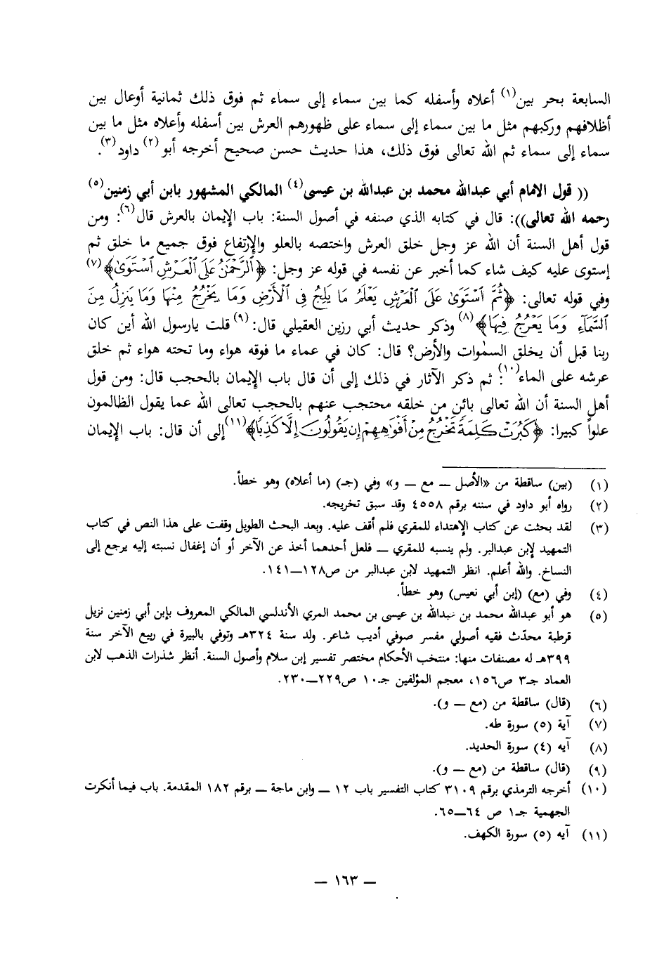 (قَوْلُ الْإِمَامِ أَبِي عَبْدِ اللَّهِ مُحَمَّدِ بْنِ عَبْدِ اللَّهِ بْنِ عِيسَى الْمَالِكِيِّ الْمَشْهُورِ بِابْنِ أَبِي زَمَنِينَ رَحِمَهُ اللَّهُ تَعَالَى) : قَالَ فِي كِتَابِهِ الَّذِي صَنَّفَهُ فِي أُصُولِ السُّنَّةِ: بَابُ الْإِيمَانِ بِالْعَرْشِ قَالَ: وَمِنْ قَوْلِ أَهْلِ السُّنَّةِ أَنَّ اللَّهَ عَزَّ وَجَلَّ خَلَقَ الْعَرْشَ وَاخْتَصَّهُ بِالْعُلُوِّ وَالِارْتِفَاعِ فَوْقَ جَمِيعِ مَا خَلَقَ ثُمَّ اسْتَوَى عَلَيْهِ كَيْفَ شَاءَ كَمَا أَخْبَرَ عَنْ نَفْسِهِ فِي قَوْلِهِ عَزَّ وَجَلَّ: {الرَّحْمَنُ عَلَى الْعَرْشِ اسْتَوَى} [طه: 5] وَفِي قَوْلِهِ تَعَالَى: {ثُمَّ اسْتَوَى عَلَى الْعَرْشِ يَعْلَمُ مَا يَلِجُ فِي الْأَرْضِ وَمَا يَخْرُجُ مِنْهَا وَمَا يَنْزِلُ مِنَ السَّمَاءِ وَمَا يَعْرُجُ فِيهَا} [الحديد: 4] وَذَكَرَ حَدِيثَ أَبِي رَزِينٍ الْعُقَيْلِيِّ قَالَ: قُلْتُ «يَا رَسُولَ اللَّهِ أَيْنَ كَانَ رَبُّنَا قَبْلَ أَنْ يَخْلُقَ السَّمَاوَاتِ وَالْأَرْضَ؟ قَالَ كَانَ فِي عَمَاءٍ مَا فَوْقَهُ هَوَاءٌ وَمَا تَحْتَهُ هَوَاءٌ ثُمَّ خَلَقَ عَرْشَهُ عَلَى الْمَاءِ» : ثُمَّ ذَكَرَ الْآثَارَ فِي ذَلِكَ إِلَى أَنْ قَالَ: بَابُ الْإِيمَانِ بِالْحُجُبِ قَالَ: وَمِنْ قَوْلِ أَهْلِ السُّنَّةِ أَنَّ اللَّهَ تَعَالَى بَائِنٌ مِنْ خَلْقِهِ مُحْتَجِبٌ عَنْهُمْ بِالْحُجُبِ تَعَالَى اللَّهُ عَمَّا يَقُولُ الظَّالِمُونَ عُلُوًّا كَبِيرًا: {كَبُرَتْ كَلِمَةً تَخْرُجُ مِنْ أَفْوَاهِهِمْ إِنْ يَقُولُونَ إِلَّا كَذِبًا} [الكهف: 5] إِلَى أَنْ قَالَ: بَابُ الْإِيمَانِ