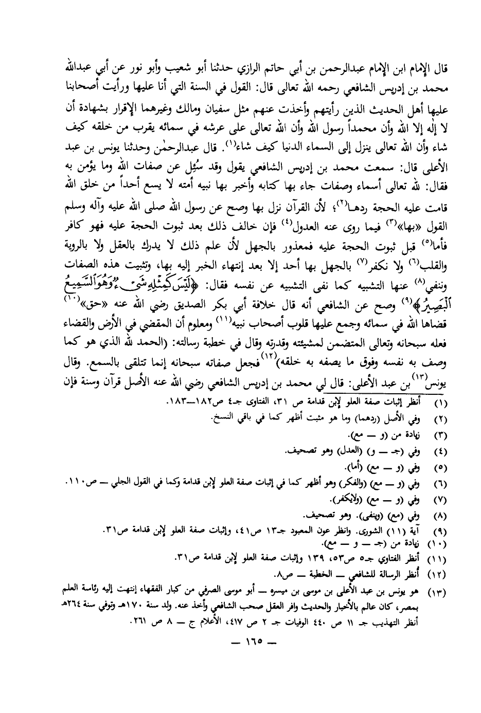 قَالَ الْإِمَامُ ابْنُ الْإِمَامِ عَبْدُ الرَّحْمَنِ بْنُ أَبِي حَاتِمٍ الرَّازِيُّ حَدَّثَنَا أَبُو شُعَيْبٍ وَأَبُو ثَوْرٍ عَنْ أَبِي عَبْدِ اللَّهِ مُحَمَّدِ بْنِ إِدْرِيسَ الشَّافِعِيِّ رَحِمَهُ اللَّهُ تَعَالَى قَالَ: الْقَوْلُ فِي السُّنَّةِ الَّتِي أَنَا عَلَيْهَا وَرَأَيْتُ أَصْحَابَنَا عَلَيْهَا أَهْلَ الْحَدِيثِ الَّذِينَ رَأَيْتُهُمْ وَأَخَذْتُ عَنْهُمْ مِثْلَ سُفْيَانَ وَمَالِكٍ وَغَيْرِهِمَا الْإِقْرَارُ بِشَهَادَةِ أَنْ لَا إِلَهَ إِلَّا اللَّهُ وَأَنَّ مُحَمَّدًا رَسُولُ اللَّهِ وَأَنَّ اللَّهَ تَعَالَى عَلَى عَرْشِهِ فِي سَمَائِهِ يَقْرُبُ مِنْ خَلْقِهِ كَيْفَ شَاءَ وَأَنَّ اللَّهَ تَعَالَى يَنْزِلُ إِلَى سَمَاءِ الدُّنْيَا كَيْفَ شَاءَ. قَالَ عَبْدُ الرَّحْمَنِ وَحَدَّثَنَا يُونُسُ بْنُ عَبْدِ الْأَعْلَى قَالَ: سَمِعْتُ أَبَا عَبْدِ اللَّهِ مُحَمَّدَ بْنَ إِدْرِيسَ الشَّافِعِيَّ يَقُولُ وَقَدْ سُئِلَ عَنْ صِفَاتِ اللَّهِ وَمَا يُؤْمِنُ بِهِ فَقَالَ: لِلَّهِ تَعَالَى أَسْمَاءٌ وَصَفَاتٌ جَاءَ بِهَا كِتَابُهُ وَأَخْبَرَ بِهَا نَبِيُّهُ أُمَّتَهُ لَا يَسَعُ أَحَدًا مِنْ خَلْقِ اللَّهِ قَامَتْ عَلَيْهِ الْحُجَّةُ رَدُّهَا ; لِأَنَّ الْقُرْآنَ نَزَلَ بِهَا وَصَحَّ عَنْ رَسُولِ اللَّهِ صَلَّى اللَّهُ عَلَيْهِ وَآلِهِ وَسَلَّمَ الْقَوْلُ " بِهَا " فِيمَا رَوَى عَنْهُ الْعُدُولُ فَإِنْ خَالَفَ ذَلِكَ بَعْدَ ثُبُوتِ الْحُجَّةِ عَلَيْهِ فَهُوَ كَافِرٌ أَمَّا قَبْلَ ثُبُوتِ الْحُجَّةِ عَلَيْهِ فَمَعْذُورٌ بِالْجَهْلِ لِأَنَّ عِلْمَ ذَلِكَ لَا يُدْرَكُ بِالْعَقْلِ وَلَا بِالرَّوِيَّةِ وَالْقَلْبِ وَلَا نُكَفِّرُ بِالْجَهْلِ بِهَا أَحَدًا إِلَّا بَعْدَ انْتِهَاءِ الْخَبَرِ إِلَيْهِ بِهَا وَتَثْبِيتِ هَذِهِ الصِّفَاتِ وَنَنْفِي عَنْهَا التَّشْبِيهَ كَمَا نَفَى التَّشْبِيهَ عَنْ نَفْسِهِ فَقَالَ: {لَيْسَ كَمِثْلِهِ شَيْءٌ وَهُوَ السَّمِيعُ الْبَصِيرُ} [الشورى: 11] وَصَحَّ عَنِ الشَّافِعِيِّ أَنَّهُ قَالَ: خِلَافَةُ أَبِي بَكْرٍ الصِّدِّيقِ رَضِيَ اللَّهُ عَنْهُ " حَقٌّ " قَضَاهَا اللَّهُ فِي سَمَائِهِ وَجَمَعَ عَلَيْهَا قُلُوبَ أَصْحَابِ نَبِيِّهِ وَمَعْلُومٌ أَنَّ الْمَقْضِيَّ فِي الْأَرْضِ وَالْقَضَاءَ فِعْلُهُ سُبْحَانَهُ وَتَعَالَى الْمُتَضَمِّنُ لِمَشِيئَتِهِ وَقُدْرَتِهِ وَقَالَ فِي خُطْبَةِ رِسَالَتِهِ: (الْحَمْدُ لِلَّهِ الَّذِي هُوَ كَمَا وَصَفَ بِهِ نَفْسَهُ وَفَوْقَ مَا يَصِفُهُ بِهِ خَلْقُهُ) فَجَعَلَ صِفَاتِهِ سُبْحَانَهُ إِنَّمَا تُتَلَقَّى بِالسَّمْعِ. وَقَالَ يُونُسُ بْنُ عَبْدِ الْأَعْلَى: قَالَ لِي مُحَمَّدُ بْنُ إِدْرِيسَ الشَّافِعِيُّ رَضِيَ اللَّهُ عَنْهُ، الْأَصْلُ قُرْآنٌ وَسُنَّةٌ فَإِنْ