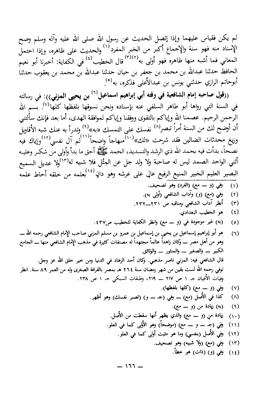 (قَوْلُ صَاحِبِهِ إِمَامِ الشَّافِعِيَّةِ فِي وَقْتِهِ أَبِي إِبْرَاهِيمَ إِسْمَاعِيلَ بْنِ يَحْيَى الْمُزَنِيِّ) : فِي رِسَالَتِهِ فِي السُّنَّةِ الَّتِي رَوَاهَا أَبُو طَاهِرٍ السِّلَفِيُّ عَنْهُ بِإِسْنَادِهِ وَنَحْنُ نَسُوقُهَا كُلَّهَا بِلَفْظِهَا. بِسْمِ اللَّهِ الرَّحْمَنِ الرَّحِيمِ. عَصَمَنَا اللَّهُ وَإِيَّاكُمْ بِالتَّقْوَى وَوَفَّقَنَا وَإِيَّاكُمْ لِمُوَافَقَةِ الْهُدَى، أَمَّا بَعْدُ فَإِنَّكَ سَأَلْتَنِي أَنْ أُوَضِّحَ لَكَ مِنَ السُّنَّةِ أَمْرًا تُبَصِّرُ نَفْسَكَ عَلَى التَّمَسُّكِ " بِهِ " وَتَدْرَأُ بِهِ عَنْكَ شُبَهَ الْأَقَاوِيلِ وَزَيْغَ مُحْدَثَاتِ الضَّالِّينَ فَقَدْ شَرَحْتُ " لَكَ " مِنْهَاجًا وَاضِحًا لَمْ آلُ نَفْسِي وَإِيَّاكَ فِيهِ نُصْحًا، بَدَأْتُ فِيهِ بِحَمْدِ اللَّهِ ذِي الرُّشْدِ وَالتَّسْدِيدِ، الْحَمْدُ لِلَّهِ أَحَقِّ مَا بُدِأَ، وَأَوْلَى مَنْ شُكِرَ، وَعَلَيْهِ أُثْنِي، الْوَاحِدِ الصَّمَدِ الَّذِي لَيْسَ لَهُ صَاحِبَةٌ وَلَا وَلَدٌ جَلَّ عَنِ الْمَثَلِ فَلَا شَبِيهَ لَهُ وَلَا عَدِيلَ السَّمِيعِ الْبَصِيرِ الْعَلِيمِ الْخَبِيرِ الْمَنِيعِ الرَّفِيعِ، عَالٍ عَلَى عَرْشِهِ وَهُوَ دَانٍ بِعِلْمِهِ مِنْ خَلْقِهِ أَحَاطَ عِلْمُهُ
