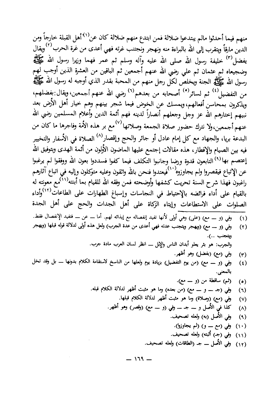 وَيُقَالُ يُفَضَّلُ خَلِيفَةُ رَسُولِ اللَّهِ صَلَّى اللَّهُ عَلَيْهِ وَآلِهِ وَسَلَّمَ ثُمَّ عُمَرُ فَهُمَا وَزِيرَا رَسُولِ اللَّهِ صَلَّى اللَّهُ عَلَيْهِ وَسَلَّمَ وَضَجِيعَاهُ، ثُمَّ عُثْمَانُ، ثُمَّ عَلِيٌّ رَضِيَ اللَّهُ عَنْهُمْ أَجْمَعِينَ ثُمَّ الْبَاقِينَ مِنَ الْعَشَرَةِ الَّذِينَ أَوْجَبَ لَهُمْ رَسُولُ اللَّهِ صَلَّى اللَّهُ عَلَيْهِ وَسَلَّمَ الْجَنَّةَ وَيُخْلَصُ لِكُلِّ رَجُلٍ مِنْهُمْ مَنِ الْمَحَبَّةِ بِقَدْرِ الَّذِي أَوْجَبَهُ لَهُ رَسُولُ اللَّهِ صَلَّى اللَّهُ عَلَيْهِ وَسَلَّمَ مِنَ التَّفْضِيلِ ثُمَّ لِسَائِرِ أَصْحَابِهِ مِنْ بَعْدِهِمْ رَضِيَ اللَّهُ عَنْهُمْ أَجْمَعِينَ، وَيُقَالُ بِفَضْلِهِمْ، وَيُذْكَرُونَ بِمَحَاسِنِ أَفْعَالِهِمْ، وَيُمْسَكُ عَنِ الْخَوْضِ فِيمَا شَجَرَ بَيْنَهُمْ وَهُمْ خِيَارُ أَهْلِ الْأَرْضِ بَعْدَ نَبِيِّهِمُ اخْتَارَهُمُ اللَّهُ عَزَّ وَجَلَّ وَجَعَلَهُمْ أَنْصَارًا لِدِينِهِ فَهُمْ أَئِمَّةُ الدِّينِ وَأَعْلَامُ الْمُسْلِمِينَ رَضِيَ اللَّهُ عَنْهُمْ أَجْمَعِينَ، وَلَا نَتْرُكُ حُضُورَ صَلَاةِ الْجُمْعَةِ وَصَلَاتَهَا مَعَ بَرِّ هَذِهِ الْأُمَّةِ وَفَاجِرِهَا مَا كَانَ مِنَ الْبِدْعَةِ بَرِيًّا، وَالْجِهَادُ مَعَ كُلِّ إِمَامٍ عَادِلٍ أَوْ جَائِرٍ وَالْحَجُّ وَإِقْصَارُ الصَّلَاةِ فِي الْأَسْفَارِ وَالتَّخْيِيرُ فِيهِ بَيْنَ الصِّيَامِ وَالْإِفْطَارِ، هَذِهِ مَقَالَاتٌ اجْتَمَعَ عَلَيْهَا الْمَاضُونَ الْأَوَّلُونَ مِنْ أَئِمَّةِ الْهُدَى وَبِتَوْفِيقِ اللَّهِ اعْتَصَمَ بِهَا التَّابِعُونَ قُدْوَةً وَرِضَا وَجَانَبُوا التَّكَلُّفَ فِيمَا كَفُّوا فَسَدَّدُوا بِعَوْنِ اللَّهِ وَوُفِّقُوا لَمْ يَرْغَبُوا عَنْ الِاتِّبَاعِ فَيُقَصِّرُوا وَلَمْ يُجَاوِزُوهُ فَيَعْتَدُوا فَنَحْنُ بِاللَّهِ وَاثِقُونَ وَعَلَيْهِ مُتَوَكِّلُونَ وَإِلَيْهِ فِي اتِّبَاعِ آثَارِهِمْ رَاغِبُونَ. فَهَذَا شَرْحُ السُّنَّةِ تَحَرَّيْتُ كَشْفَهَا وَأَوْضَحْتُهُ، فَمَنْ وَفَّقَهُ اللَّهُ لِلْقِيَامِ بِمَا أَبَنْتُهُ مَعَ مَعُونَتِهِ لَهُ بِالْقِيَامِ عَلَى أَدَاءِ فَرَائِضِهِ بِالِاحْتِيَاطِ فِي النَّجَاسَاتِ وَإِسْبَاغِ الطِّهَارَاتِ عَلَى الطَّاعَاتِ وَأَدَاءِ الصَّلَوَاتِ عَلَى الِاسْتِطَاعَاتِ وَإِيتَاءِ الزَّكَاةِ عَلَى أَهْلِ الْجِدَاتِ وَالْحَجِّ عَلَى أَهْلِ الْجِدَةِ