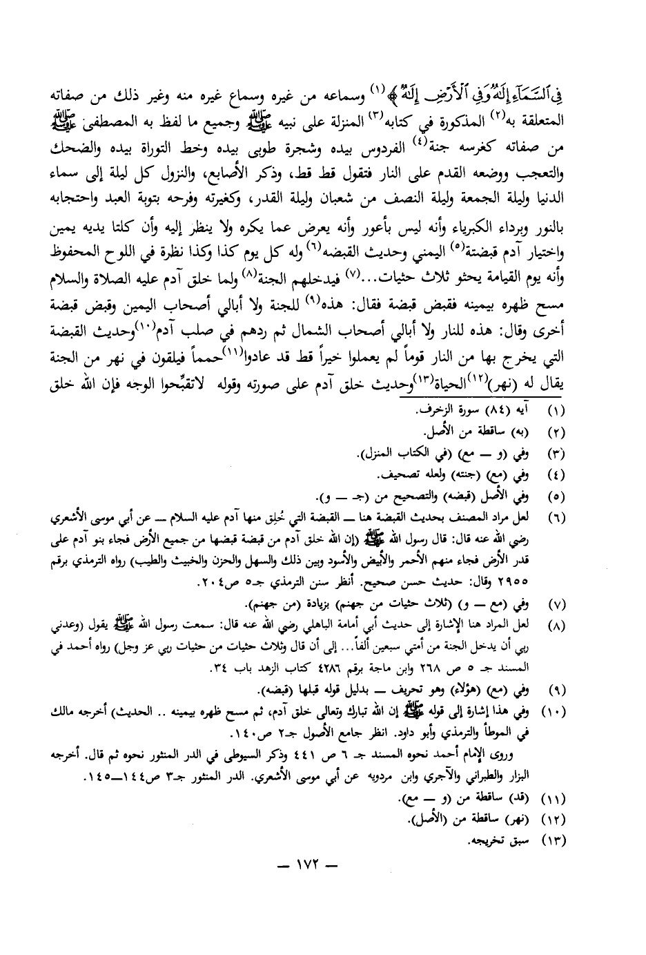 {وَهُوَ الَّذِي فِي السَّمَاءِ إِلَهٌ وَفِي الْأَرْضِ إِلَهٌ} [الزخرف: 84] وَسَمَاعِهِ مِنْ غَيْرِهِ، وَسَمَاعِ غَيْرِهِ مِنْهُ وَغَيْرِ ذَلِكَ مِنْ صِفَاتِهِ الْمُتَعَلِّقَةِ بِهِ الْمَذْكُورَةِ فِي كِتَابِهِ الْمُنَزَّلِ عَلَى نَبِيِّهِ صَلَّى اللَّهُ عَلَيْهِ وَسَلَّمَ وَجَمِيعِ مَا لَفَظَ بِهِ الْمُصْطَفَى صَلَّى اللَّهُ عَلَيْهِ وَسَلَّمَ مِنْ صِفَاتِهِ كَغَرْسِهِ جَنَّةَ الْفِرْدَوْسِ بِيَدِهِ وَشَجَرَةَ طُوبَى بِيَدِهِ وَخَطِّ التَّوْرَاةِ بِيَدِهِ وَالضَّحِكِ وَالتَّعَجُّبِ وَوَضْعِهِ الْقَدَمَ عَلَى النَّارِ فَتَقُولُ: قَطْ قَطْ، وَذِكْرِ الْأَصَابِعِ، وَالنُّزُولِ كُلَّ لَيْلَةٍ إِلَى سَمَاءِ الدُّنْيَا وَلَيْلَةَ الْجُمْعَةِ وَلَيْلَةَ النِّصْفِ مِنْ شَعْبَانَ وَلَيْلَةَ الْقَدْرِ، وَكَغَيْرَتِهِ وَفَرَحِهِ بِتَوْبَةِ الْعَبْدِ وَاحْتِجَابِهِ بِالنُّورِ وَبِرِدَاءِ الْكِبْرِيَاءِ وَأَنَّهُ لَيْسَ بِأَعْوَرَ، وَأَنَّهُ يُعْرِضُ عَمَّا يَكْرَهُ وَلَا يَنْظُرُ إِلَيْهِ، وَأَنَّ كِلْتَا يَدَيْهِ يَمِينٌ وَاخْتِيَارِ آدَمَ قَبْضَتَةُ الْيُمْنَى وَحَدِيثِ الْقَبْضَةِ وَلَهُ كُلَّ يَوْمٍ كَذَا وَكَذَا نَظْرَةٌ فِي اللَّوْحِ الْمَحْفُوظِ وَأَنَّهُ يَوْمَ الْقِيَامَةِ يَحْثُو ثَلَاثَ حَثَيَاتٍ. . . فَيُدْخِلُهُمُ الْجَنَّةَ وَلَمَّا خَلَقَ آدَمَ عَلَيْهِ الصَّلَاةُ وَالسَّلَامُ مَسَحَ ظَهْرَهُ بِيَمِينِهِ فَقَبَضَ قَبْضَةً فَقَالَ: هَذِهِ لِلْجَنَّةِ وَلَا أُبَالِي أَصْحَابَ الْيَمِينِ، وَقَبَضَ قَبْضَةً أُخْرَى وَقَالَ: هَذِهِ لِلنَّارِ وَلَا أُبَالِي أَصْحَابَ الشِّمَالِ ثُمَّ رَدَّهُمْ فِي صُلْبِ آدَمَ، وَحَدِيثِ الْقَبْضَةِ الَّتِي يَخْرُجُ بِهَا مِنَ النَّارِ قَوْمًا لَمْ يَعْمَلُوا خَيْرًا قَطُّ عَادُوا حُمَمًا فَيُلْقَوْنَ فِي نَهْرٍ مِنَ الْجَنَّةِ يُقَالُ لَهُ: (نَهْرُ) الْحَيَاةِ، وَحَدِيثُ خَلْقِ آدَمَ عَلَى صُورَتِهِ وَقَوْلِهِ: «لَا تُقَبِّحُوا الْوَجْهَ فَإِنَّ اللَّهَ خَلَقَ