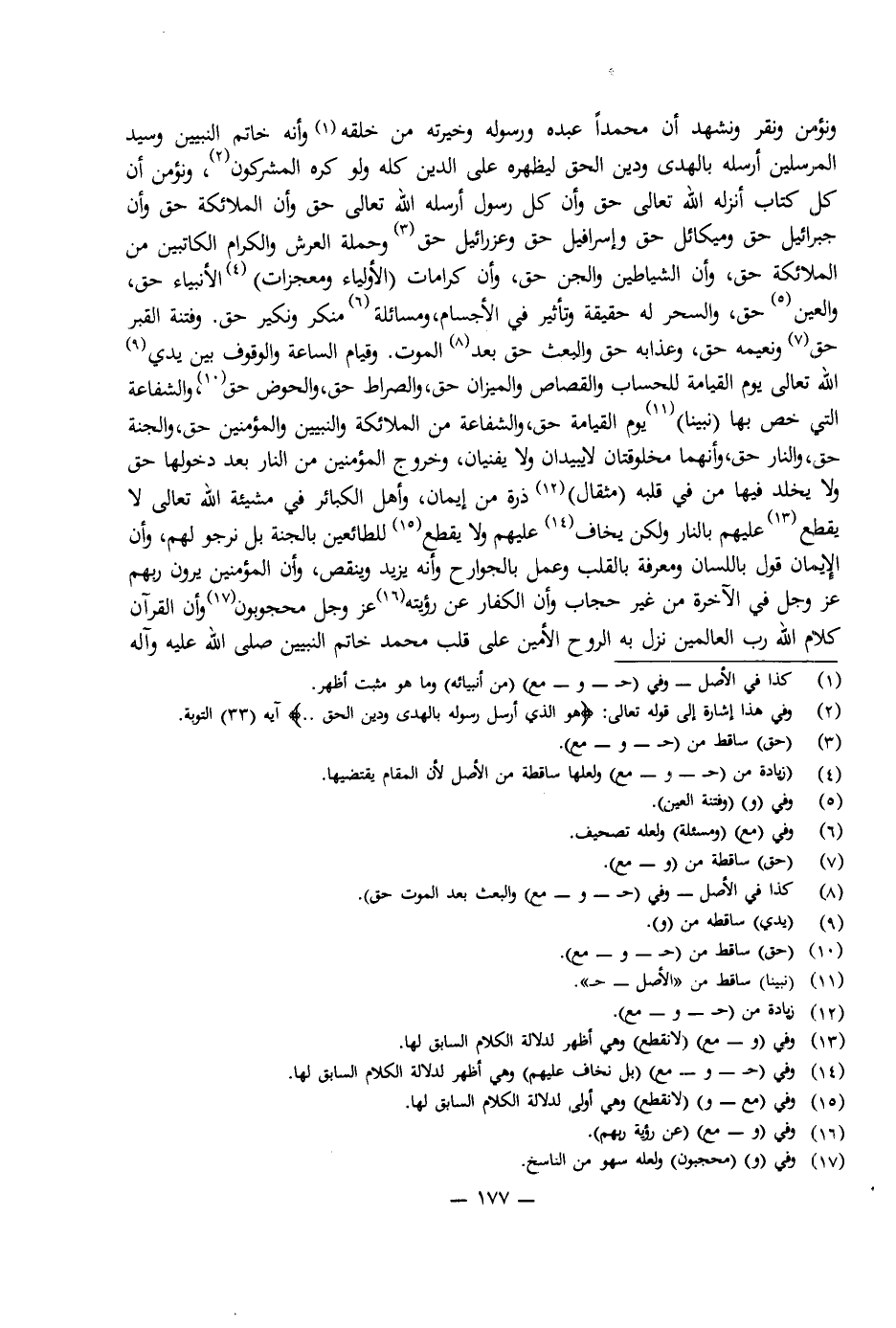 وَنُؤْمِنُ وَنُقِرُّ وَنَشْهَدُ أَنَّ مُحَمَّدًا عَبْدُهُ وَرَسُولُهُ وَخِيرَتُهُ مِنْ خَلْقِهِ وَأَنَّهُ خَاتَمُ النَّبِيِّينَ وَسَيِّدِ الْمُرْسَلِينَ أَرْسَلَهُ بِالْهُدَى وَدِينِ الْحَقِّ لِيُظْهِرَهُ عَلَى الدِّينِ كُلِّهِ وَلَوْ كَرِهَ الْمُشْرِكُونَ، وَنُؤْمِنُ أَنَّ كُلَّ كِتَابٍ أَنْزَلَهُ اللَّهُ تَعَالَى حَقٌّ، وَأَنَّ كُلَّ رَسُولٍ أَرْسَلَهُ اللَّهُ تَعَالَى حَقٌّ، وَأَنَّ الْمَلَائِكَةَ حَقٌّ، وَأَنَّ جِبْرَائِيلَ حَقٌّ، وَمِيكَائِيلَ حُقٌّ، وَإِسْرَافِيلَ حُقٌّ، وَعِزْرَائِيلَ حَقٌّ، وَحَمَلَةَ الْعَرْشِ وَالْكِرَامَ الْكَاتِبِينَ مِنَ الْمَلَائِكَةِ حَقٌّ، وَأَنَّ الشَّيَاطِينَ وَالْجِنَّ حَقٌّ، وَأَنَّ كَرَامَاتِ (الْأَوْلِيَاءِ وَمُعْجِزَاتِ) الْأَنْبِيَاءِ حَقٌّ، وَالْعَيْنَ حَقٌّ، وَالسِّحْرَ لَهُ حَقِيقَةٌ وَتَأْثِيرٌ فِي الْأَجْسَامِ، وَمُسَائَلَةَ مُنْكَرٍ وَنَكِيرٍ حَقٌّ، وَفِتْنَةَ الْقَبْرِ حَقٌّ وَنَعِيمَهُ حَقٌّ، وَعَذَابَهُ حَقٌّ وَالْبَعْثَ حَقٌّ بَعْدَ الْمَوْتِ. وَقِيَامَ السَّاعَةِ وَالْوُقُوفَ بَيْنَ يَدَيِ اللَّهِ تَعَالَى يَوْمَ الْقِيَامَةِ لِلْحِسَابِ وَالْقِصَاصَ وَالْمِيزَانَ حَقٌّ، وَالصِّرَاطَ حَقٌّ، وَالْحَوْضَ وَالشَّفَاعَةَ الَّتِي خُصَّ بِهَا (نَبِيُّنَا) يَوْمَ الْقِيَامَةِ حَقٌّ، وَالشَّفَاعَةَ مِنَ الْمَلَائِكَةِ وَالنَّبِيِّينَ وَالْمُؤْمِنِينَ حَقٌّ، وَالْجَنَّةَ حَقٌّ، وَالنَّارَ حَقٌّ، وَأَنَّهُمَا مَخْلُوقَتَانِ لَا يَبِيدَانِ وَلَا يَفْنَيَانِ، وَخُرُوجَ الْمُؤْمِنِينَ مِنَ النَّارِ بَعْدَ دُخُولِهَا حَقٌّ، وَلَا يَخْلُدُ فِيهَا مَنْ فِي قَلْبِهِ مِثْقَالُ ذَرَّةٍ مِنْ إِيمَانٍ، وَأَهْلَ الْكَبَائِرِ فِي مَشِيئَةِ اللَّهِ تَعَالَى لَا يُقْطَعُ عَلَيْهِمْ بِالنَّارِ وَلَكِنْ يُخَافُ عَلَيْهِمْ، وَلَا يُقْطَعُ لِلطَّائِعِينَ بِالْجَنَّةِ بَلْ نَرْجُو لَهُمْ، وَأَنَّ الْإِيمَانَ قَوْلٌ بِاللِّسَانِ وَمَعْرِفَةٌ بِالْقَلْبِ وَعَمَلٌ بِالْجَوَارِحِ وَأَنَّهُ يَزِيدُ وَيَنْقُصُ، وَأَنَّ الْمُؤْمِنِينَ يَرَوْنَ رَبَّهُمْ عَزَّ وَجَلَّ فِي الْآخِرَةِ مِنْ غَيْرِ حِجَابٍ وَأَنَّ الْكُفَّارَ عَنْ رُؤْيَتِهِ عَزَّ وَجَلَّ مَحْجُوبُونَ وَأَنَّ الْقُرْآنَ كَلَامُ اللَّهِ رَبِّ الْعَالَمِينَ نَزَلَ بِهِ الرُّوحُ الْأَمِينُ عَلَى قَلْبِ مُحَمَّدٍ خَاتَمِ النَّبِيِّينَ صَلَّى اللَّهُ عَلَيْهِ وَآلِهِ