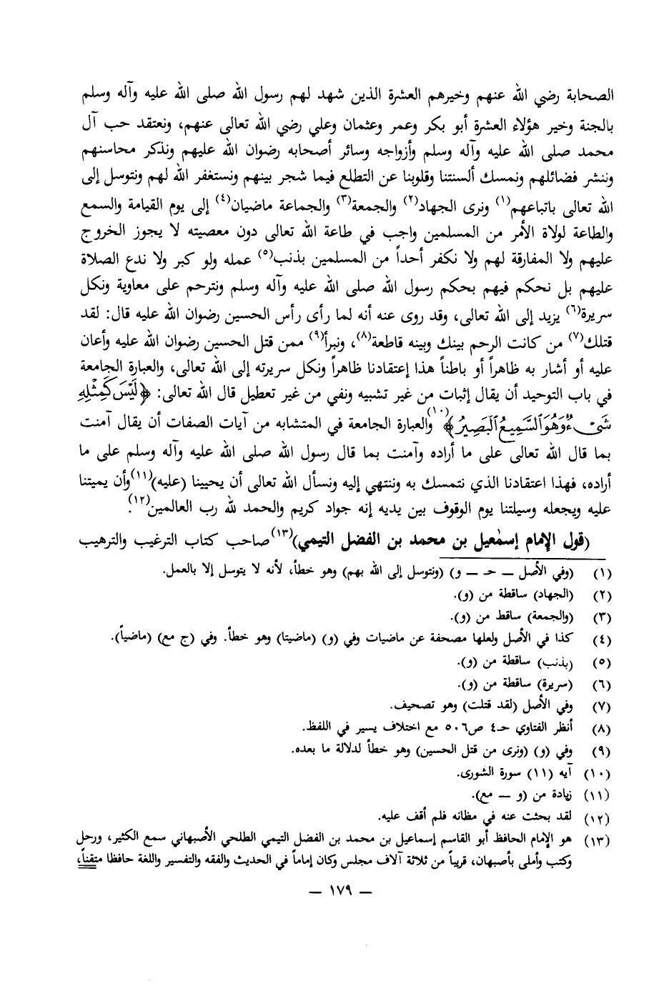 (قَوْلُ الْإِمَامِ إِسْمَاعِيلَ بْنِ مُحَمَّدِ بْنِ الْفَضْلِ التَّيْمِيِّ) صَاحِبِ كِتَابِ التَّرْغِيبِ وَالتَّرْهِيبِ