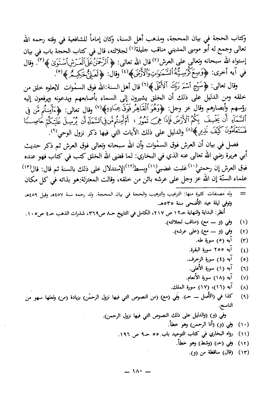 وَكِتَابِ الْحُجَّةِ فِي بَيَانِ الْمَحَجَّةِ، وَمَذْهَبِ أَهْلِ السُّنَّةِ، وَكَانَ إِمَامًا لِلشَّافِعِيَّةِ فِي وَقْتِهِ رَحِمَهُ اللَّهُ تَعَالَى وَجَمَعَ لَهُ أَبُو مُوسَى الْمَدِينِيُّ مَنَاقِبَ جَلِيلَةً لِجَلَالَتِهِ، قَالَ فِي كِتَابِ الْحُجَّةِ (بَابٌ فِي بَيَانِ اسْتِوَاءِ اللَّهِ سُبْحَانَهُ وَتَعَالَى عَلَى الْعَرْشِ) قَالَ اللَّهُ تَعَالَى: {الرَّحْمَنُ عَلَى الْعَرْشِ اسْتَوَى} [طه: 5] . وَقَالَ فِي آيَةٍ أُخْرَى: {وَسِعَ كُرْسِيُّهُ السَّمَاوَاتِ وَالْأَرْضَ} [البقرة: 255] وَقَالَ: {لَعَلِيٌّ حَكِيمٌ} [الزخرف: 4] .