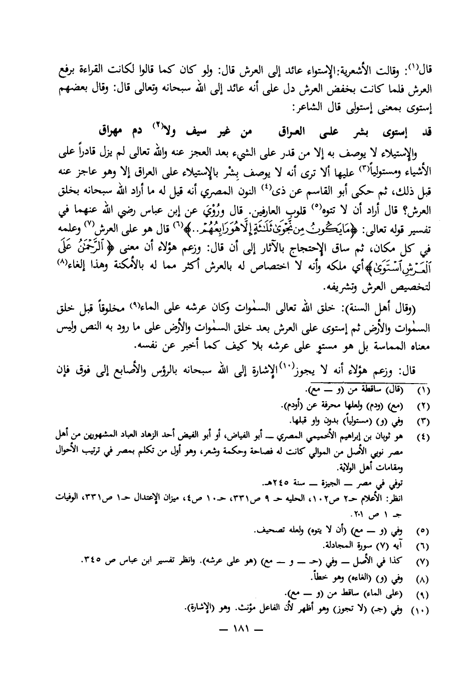 قَالَ: وَقَالَتِ الْأَشْعَرِيَّةُ: الِاسْتِوَاءُ عَائِدٌ إِلَى الْعَرْشِ قَالَ: وَلَوْ كَانَ كَمَا قَالُوا لَكَانَتِ الْقِرَاءَةُ بِرَفْعِ الْعَرْشِ فَلَمَّا كَانَتْ بِخَفْضِ الْعَرْشِ دَلَّ عَلَى أَنَّهُ عَائِدٌ إِلَى اللَّهِ سُبْحَانَهُ وَتَعَالَى قَالَ: وَقَالَ بَعْضُهُمُ: اسْتَوَى بِمَعْنَى اسْتَوْلَى قَالَ الشَّاعِرُ:
