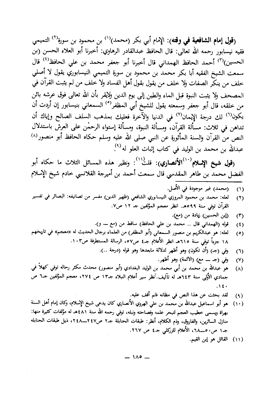 (قَوْلُ إِمَامِ الشَّافِعِيَّةِ فِي وَقْتِهِ) : الْإِمَامِ أَبِي بَكْرٍ (مُحَمَّدِ) بْنِ مَحْمُودِ بْنِ سَوْرَةَ التَّمِيمِيِّ فَقِيهِ نَيْسَابُورَ رَحِمَهُ اللَّهُ تَعَالَى، قَالَ الْحَافِظُ عَبْدُ الْقَادِرِ الرُّهَاوِيُّ: أَخْبَرَنَا أَبُو الْعَلَاءِ الْحَسَنُ (بْنُ الْحُسَيْنِ) أَحْمَدُ الْحَافِظُ الْهَمْدَانِيُّ قَالَ: أَخْبَرَنَا أَبُو جَعْفَرٍ مُحَمَّدُ بْنُ عَلِيٍّ الْحَافِظُ قَالَ: سَمِعْتُ الشَّيْخَ الْفَقِيهَ أَبَا بَكْرٍ مُحَمَّدَ بْنَ مَحْمُودِ بْنِ سَوْرَةَ التَّمِيمِيَّ النَّيْسَابُورِيَّ يَقُولُ: لَا أُصَلِّي خَلْفَ مَنْ يُنْكِرُ الصِّفَاتِ، وَلَا خَلْفَ مَنْ يَقُولُ بِقَوْلِ أَهْلِ الْفَسَادِ، وَلَا خَلْفَ مَنْ لَمْ يُثْبِتِ الْقُرْآنَ فِي الْمُصْحَفِ، وَلَا يُثْبِتِ النُّبُوَّةَ قَبْلَ الْمَاءِ وَالطِّينِ إِلَى يَوْمِ الدِّينِ، وَلَا يُقِرُّ بِأَنَّ اللَّهَ تَعَالَى فَوْقَ عَرْشِهِ بَائِنٌ مِنْ خَلْقِهِ، قَالَ أَبُو جَعْفَرٍ: وَسَمِعْتُهُ يَقُولُ لِلشَّيْخِ أَبِي الْمُظَفَّرِ السَمْعَانِيِّ بِنَيْسَابُورَ: إِنْ أَرَدْتَ أَنْ يَكُونَ لَكَ دَرَجَةُ الْإِيمَانِ فِي الدُّنْيَا وَالْآخِرَةِ فَعَلَيْكَ بِمَذْهَبِ السَّلَفِ الصَّالِحِ وَإِيَّاكَ أَنْ تُدَاهِنَ فِي ثَلَاثٍ: مَسْأَلَةِ الْقُرْآنِ، وَمَسْأَلَةِ النُّبُوَّةِ، وَمَسْأَلَةِ اسْتِوَاءِ الرَّحْمَنِ عَلَى الْعَرْشِ، بِاسْتِدْلَالِ النَّصِّ مِنَ الْقُرْآنِ وَالسُّنَّةِ الْمَأْثُورَةِ عَنِ النَّبِيِّ صَلَّى اللَّهُ عَلَيْهِ وَسَلَّمَ، حَكَاهُ الْحَافِظُ أَبُو مَنْصُورٍ عَبْدُ اللَّهُ بْنُ مُحَمَّدِ بْنِ الْوَلِيدِ فِي كِتَابِ إِثْبَاتِ الْعُلُوِّ لَهُ.