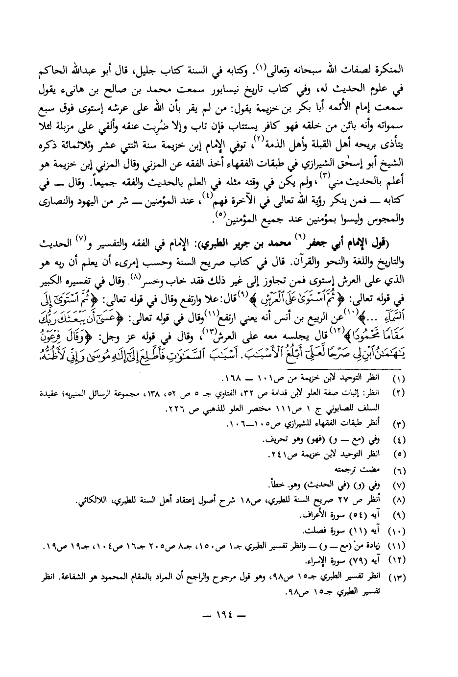 (قَوْلُ الْإِمَامِ أَبِي جَعْفَرٍ مُحَمَّدِ بْنِ جَرِيرٍ الطَّبَرِيِّ) : الْإِمَامِ فِي الْفِقْهِ وَالتَّفْسِيرِ وَالْحَدِيثِ وَالتَّارِيخِ وَاللُّغَةِ وَالنَّحْوِ وَالْقُرْآنِ. قَالَ فِي كِتَابِ صَرِيحِ السُّنَّةِ: وَحَسْبُ امْرِئٍ أَنْ يَعْلَمَ أَنَّ رَبَّهُ هُوَ الَّذِي عَلَى الْعَرْشِ اسْتَوَى فَمَنْ تَجَاوَزَ إِلَى غَيْرِ ذَلِكَ فَقَدْ خَابَ وَخَسِرَ وَقَالَ فِي تَفْسِيرِهِ الْكَبِيرِ فِي قَوْلِهِ تَعَالَى: {ثُمَّ اسْتَوَى عَلَى الْعَرْشِ} [الأعراف: 54] قَالَ: عَلَا وَارْتَفَعَ وَقَالَ فِي قَوْلِهِ تَعَالَى: {ثُمَّ اسْتَوَى إِلَى السَّمَاءِ} [البقرة: 29] . عَنِ الرَّبِيعِ بْنِ أَنَسٍ أَنَّهُ يَعْنِي: ارْتَفَعَ، وَقَالَ فِي قَوْلِهِ تَعَالَى: {عَسَى أَنْ يَبْعَثَكَ رَبُّكَ مَقَامًا مَحْمُودًا} [الإسراء: 79] قَالَ يُجْلِسُهُ مَعَهُ عَلَى الْعَرْشِ، وَقَالَ فِي قَوْلِهِ عَزَّ وَجَلَّ: {وَقَالَ فِرْعَوْنُ يَاهَامَانُ ابْنِ لِي صَرْحًا لَعَلِّي أَبْلُغُ الْأَسْبَابَ - أَسْبَابَ السَّمَاوَاتِ فَأَطَّلِعَ إِلَى إِلَهِ مُوسَى وَإِنِّي لَأَظُنُّهُ كَاذِبًا} [غافر: 36 - 37]