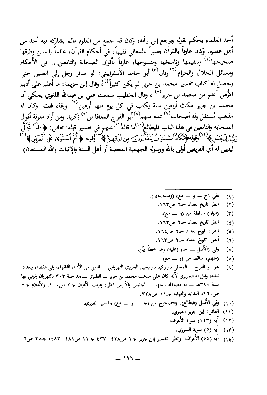 أَحَدَ الْعُلَمَاءِ يُحْكَمُ بِقَوْلِهِ وَيُرْجَعُ إِلَى رَأْيِهِ، وَكَانَ قَدْ جَمَعَ مِنَ الْعُلُومِ مَا لَمْ يُشَارِكْهُ فِيهِ أَحَدٌ مِنْ أَهْلِ عَصْرِهِ، وَكَانَ عَارِفًا بِالْقُرْآنِ بَصِيرًا بِالْمَعَانِي، فَقِيهًا فِي أَحْكَامِ الْقُرْآنِ، عَالِمًا بِالسُّنَنِ وَطُرُقِهَا وَصَحِيحِهَا وَسَقِيمِهَا وَنَاسِخِهَا وَمَنْسُوخِهَا، عَارِفًا بِأَقْوَالِ الصَّحَابَةِ وَالتَّابِعِينَ فِي الْأَحْكَامِ وَمَسَائِلِ الْحَلَالِ وَالْحَرَامِ، قَالَ أَبُو حَامِدٍ الْإِسْفَرَايِينِيُّ: لَوْ سَافَرَ رَجُلٌ إِلَى الصِّينِ حَتَّى يَحْصُلَ لَهُ كِتَابُ تَفْسِيرِ مُحَمَّدِ بْنِ جَرِيرٍ لَمْ يَكُنْ كَثِيرًا، وَقَالَ ابْنُ خُزَيْمَةَ مَا أَعْلَمُ عَلَى أَدِيمِ الْأَرْضِ أَعْلَمَ مِنْ مُحَمَّدِ بْنِ جَرِيرٍ، وَقَالَ الْخَطِيبُ: سَمِعْتُ عَلِيَّ بْنَ عَبْدِ اللَّهِ اللُّغَوِيَّ يَحْكِي أَنَّ مُحَمَّدَ بْنَ جَرِيرٍ مَكَثَ أَرْبَعِينَ سَنَةً يَكْتُبُ فِي كُلِّ يَوْمٍ مِنْهَا أَرْبَعِينَ وَرَقَةً، قُلْتُ: وَكَانَ لَهُ مَذْهَبٌ مُسْتَقِلٌّ وَلَهُ أَصْحَابٌ عِدَّةٌ مِنْهُمْ: أَبُو الْفَرَجِ الْمُعَافَا بْنُ زَكَرِيَّا. وَمَنْ أَرَادَ مَعْرِفَةَ أَقْوَالِ الصَّحَابَةِ وَالتَّابِعِينَ فِي هَذَا الْبَابِ فَلْيُطَالِعْ مَا قَالَهُ عَنْهُمْ فِي تَفْسِيرِ قَوْلِهِ تَعَالَى: {فَلَمَّا تَجَلَّى رَبُّهُ لِلْجَبَلِ} [الأعراف: 143] وَقَوْلِهِ: {تَكَادُ السَّمَاوَاتُ يَتَفَطَّرْنَ مِنْ فَوْقِهِنَّ} [الشورى: 5] وَقَوْلِهِ: {ثُمَّ اسْتَوَى عَلَى الْعَرْشِ} [الأعراف: 54] لِيَتَبَيَّنَ لَهُ أَيُّ الْفَرِيقَيْنِ أَوْلَى بِاللَّهِ وَرَسُولِهِ الْجَهْمِيَّةِ الْمُعَطِّلَةِ أَوْ أَهْلِ السُّنَّةِ وَالْإِثْبَاتِ، وَاللَّهُ الْمُسْتَعَانُ.