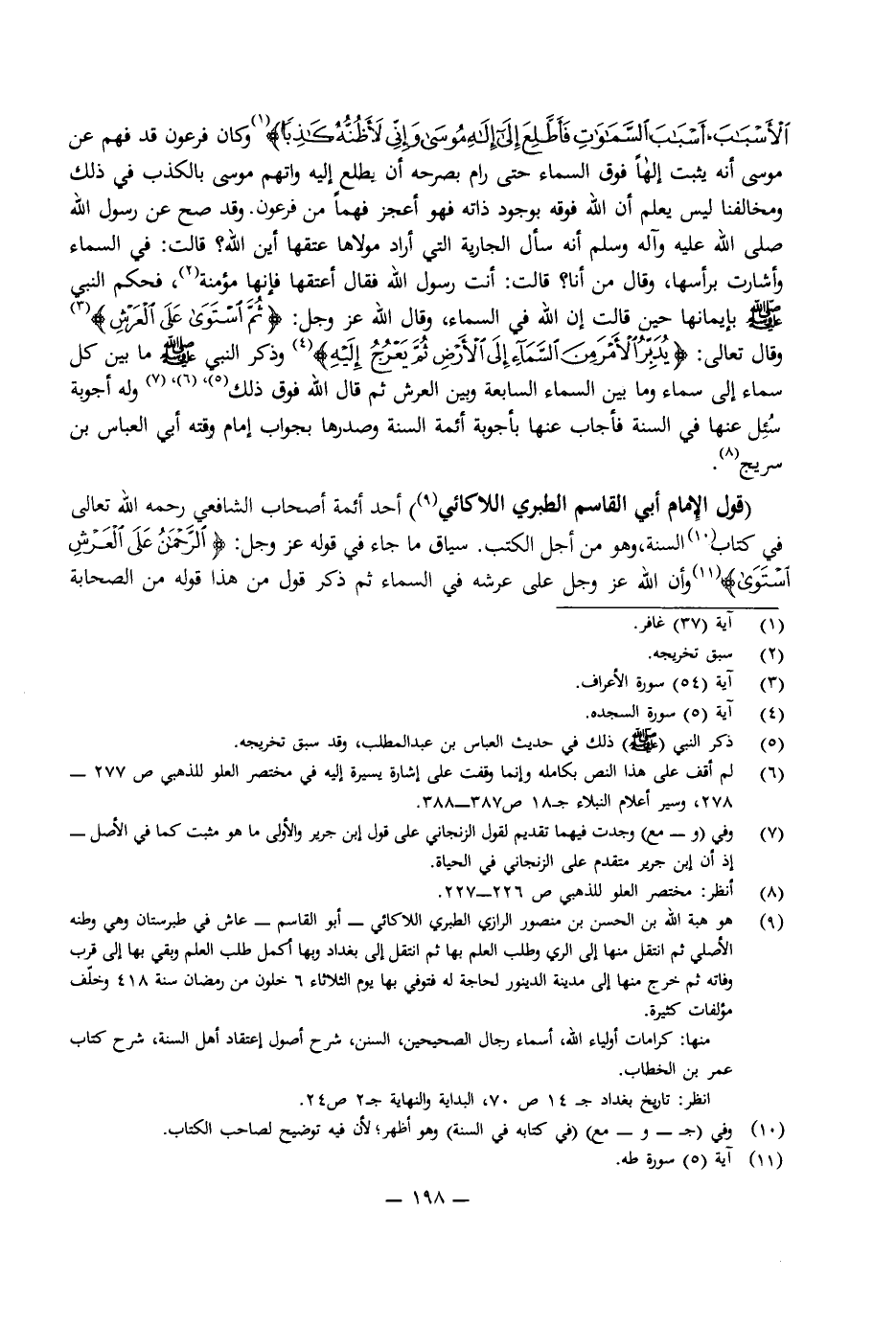 (قَوْلُ الْإِمَامِ أَبِي الْقَاسِمِ الطَّبَرِيِّ اللَّالَكَائِيِّ) : أَحَدِ أَئِمَّةِ أَصْحَابِ الشَّافِعِيِّ رَحِمَهُ اللَّهُ تَعَالَى فِي كِتَابِ السُّنَّةِ، وَهُوَ مِنْ أَجَلِّ الْكُتُبِ. سِيَاقُ مَا جَاءَ فِي قَوْلِهِ عَزَّ وَجَلَّ: {الرَّحْمَنُ عَلَى الْعَرْشِ اسْتَوَى} [طه: 5] وَأَنَّ اللَّهَ عَزَّ وَجَلَّ عَلَى عَرْشِهِ فِي السَّمَاءِ ثُمَّ ذَكَرَ قَوْلَ مَنْ هَذَا قَوْلُهُ مِنَ الصَّحَابَةِ