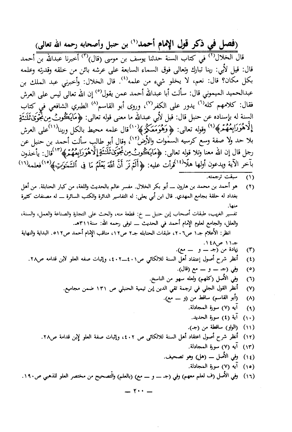 قَالَ الْخَلَّالُ فِي كِتَابِ السُّنَّةِ: حَدَّثَنَا يُوسُفُ بْنُ مُوسَى (قَالَ) : أَخْبَرَنَا عَبْدُ اللَّهِ بْنُ أَحْمَدَ قَالَ: قِيلَ لِأَبِي: رَبُّنَا تَبَارَكَ وَتَعَالَى فَوْقَ السَّمَاءِ السَّابِعَةِ عَلَى عَرْشِهِ بَائِنٌ مِنْ خَلْقِهِ، وَقُدْرَتُهُ وَعَلْمُهُ بِكُلِّ مَكَانٍ؟ قَالَ: نَعَمْ، لَا يَخْلُو شَيْءٌ مِنْ عِلْمِهِ. قَالَ الْخَلَّالُ: وَأَخْبَرَنِي عَبْدُ الْمَلِكِ بْنُ عَبْدِ الْحَمِيدِ الْمَيْمُونِيُّ قَالَ: سَأَلْتُ أَبَا عَبْدِ اللَّهِ أَحْمَدَ عَمَّنْ يَقُولُ: إِنَّ اللَّهَ تَعَالَى لَيْسَ عَلَى الْعَرْشِ فَقَالَ: كَلَامُهُمْ كُلُّهُ يَدُورُ عَلَى الْكُفْرِ، وَرَوَى أَبُو الْقَاسِمِ الطَّبَرِيُّ الشَّافِعِيُّ فِي كِتَابِ السُّنَّةِ لَهُ بِإِسْنَادِهِ عَنْ حَنْبَلٍ قَالَ: قِيلَ لِأَبِي عَبْدِ اللَّهِ: مَا مَعْنَى قَوْلِهِ تَعَالَى: {مَا يَكُونُ مِنْ نَجْوَى ثَلَاثَةٍ إِلَّا هُوَ رَابِعُهُمْ} [المجادلة: 7] وَقَوْلِهِ تَعَالَى: {وَهُوَ مَعَكُمْ} [الحديد: 4] قَالَ: عِلْمُهُ مُحِيطٌ بِالْكُلِّ وَرَبُّنَا عَلَى الْعَرْشِ بِلَا حَدٍّ وَلَا صِفَةٍ وَسِعَ كُرْسِيُّهُ السَّمَاوَاتِ وَالْأَرْضَ، وَقَالَ أَبُو طَالِبٍ: سَأَلْتُ أَحْمَدَ بْنَ حَنْبَلٍ عَنْ رَجُلٍ قَالَ: إِنَّ اللَّهَ مَعَنَا وَتَلَا قَوْلَهُ تَعَالَى: {مَا يَكُونُ مِنْ نَجْوَى ثَلَاثَةٍ إِلَّا هُوَ رَابِعُهُمْ} [المجادلة: 7] قَالَ: يَأْخُذُونَ بِآخِرِ الْآيَةِ وَيَدَعُونَ أَوَّلَهَا، هَلَّا قَرَأْتَ عَلَيْهِ: {أَلَمْ تَرَ أَنَّ اللَّهَ يَعْلَمُ مَا فِي السَّمَاوَاتِ} [المجادلة: 7] فَعِلْمُهُ