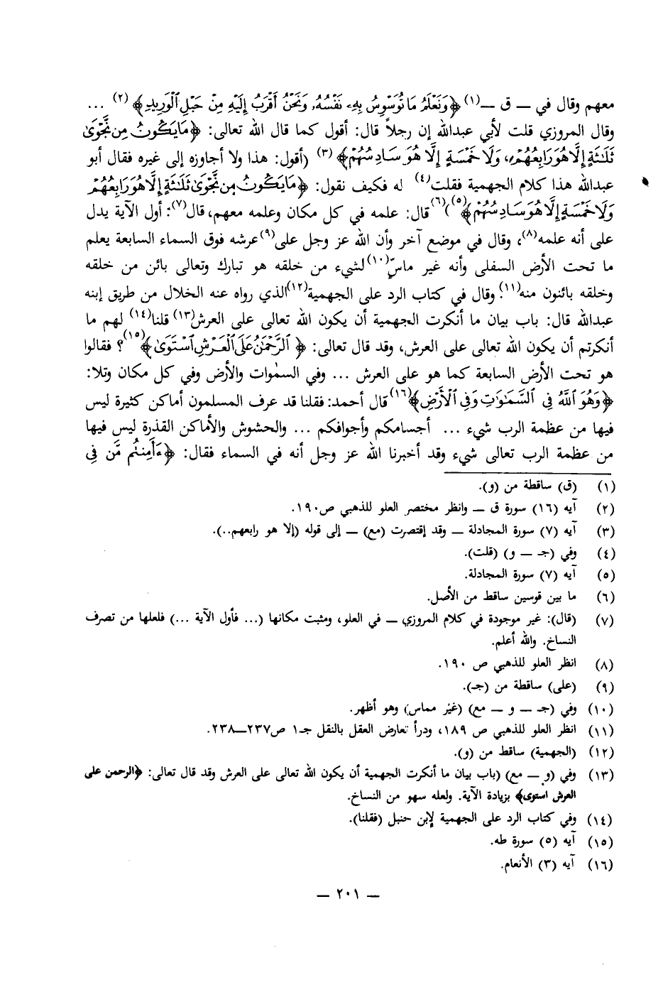 مَعَهُمْ وَقَالَ فِي (ق) {وَنَعْلَمُ مَا تُوَسْوِسُ بِهِ نَفْسُهُ وَنَحْنُ أَقْرَبُ إِلَيْهِ مِنْ حَبْلِ الْوَرِيدِ} [ق: 16] وَقَالَ الْمَرْوَزِيُّ: قُلْتُ لِأَبِي عَبْدِ اللَّهِ أَنَّ رَجُلًا قَالَ: أَقُولُ كَمَا قَالَ اللَّهُ تَعَالَى: {مَا يَكُونُ مِنْ نَجْوَى ثَلَاثَةٍ إِلَّا هُوَ رَابِعُهُمْ وَلَا خَمْسَةٍ إِلَّا هُوَ سَادِسُهُمْ} [المجادلة: 7] أَقُولُ: هَذَا وَلَا أُجَاوِزُهُ إِلَى غَيْرِهِ فَقَالَ أَبُو عَبْدِ اللَّهِ هَذَا كَلَامٌ الْجَهْمِيَّةِ فَقُلْتُ لَهُ: فَكَيْفَ نَقُولُ {مَا يَكُونُ مِنْ نَجْوَى ثَلَاثَةٍ إِلَّا هُوَ رَابِعُهُمْ وَلَا خَمْسَةٍ إِلَّا هُوَ سَادِسُهُمْ} [المجادلة: 7] قَالَ: عِلْمُهُ فِي كُلِّ مَكَانٍ وَعِلْمُهُ مَعَهُمْ، قَالَ: أَوَّلُ الْآيَةِ يَدُلُّ عَلَى أَنَّهُ عِلْمُهُ، وَقَالَ فِي مَوْضِعٍ آخَرَ: وَأَنَّ اللَّهَ عَزَّ وَجَلَّ عَلَى عَرْشِهِ فَوْقَ السَّمَاءِ السَّابِعَةِ يَعْلَمُ مَا تَحْتَ الْأَرْضِ السُّفْلَى وَأَنَّهُ غَيْرُ مُمَاسٍّ لِشَيْءٍ مِنْ خَلْقِهِ هُوَ تَبَارَكَ وَتَعَالَى بَائِنٌ مِنْ خَلْقِهِ وَخَلْقُهُ بَائِنُونَ مِنْهُ. وَقَالَ فِي كِتَابِ الرَّدِّ عَلَى الْجَهْمِيَّةِ الَّذِي رَوَاهُ عَنْهُ الْخَلَّالُ مِنْ طَرِيقِ ابْنِهِ عَبْدِ اللَّهِ قَالَ: بَابُ بَيَانِ مَا نَكِرَتِ الْجَهْمِيَّةُ أَنْ يَكُونَ اللَّهُ تَعَالَى عَلَى الْعَرْشِ، قُلْنَا لَهُمْ مَا أَنْكَرْتُمْ أَنْ يَكُونَ اللَّهُ تَعَالَى عَلَى الْعَرْشِ، وَقَدْ قَالَ تَعَالَى: {الرَّحْمَنُ عَلَى الْعَرْشِ اسْتَوَى} [طه: 5] ؟ فَقَالُوا: هُوَ تَحْتَ الْأَرْضِ السَّابِعَةِ كَمَا هُوَ عَلَى الْعَرْشِ وَفِي السَّمَاوَاتِ وَالْأَرْضِ وَفِي كُلِّ مَكَانٍ وَتَلَا: {وَهُوَ اللَّهُ فِي السَّمَاوَاتِ وَفِي الْأَرْضِ} [الأنعام: 3] قَالَ أَحْمَدُ: فَقُلْنَا قَدْ عَرَفَ الْمُسْلِمُونَ أَمَاكِنَ كَثِيرَةً لَيْسَ فِيهَا مِنْ عَظَمَةِ الرَّبِّ شَيْءٌ أَجْسَامُكُمْ وَأَجْوَافُكُمْ وَالْحُشُوشُ وَالْأَمَاكِنُ الْقَذِرَةِ لَيْسَتْ فِيهَا مِنْ عَظَمَةِ الرَّبِّ تَعَالَى شَيْءٌ، وَقَدْ أَخْبَرَنَا اللَّهُ عَزَّ وَجَلَّ أَنَّهُ فِي السَّمَاءِ فَقَالَ: