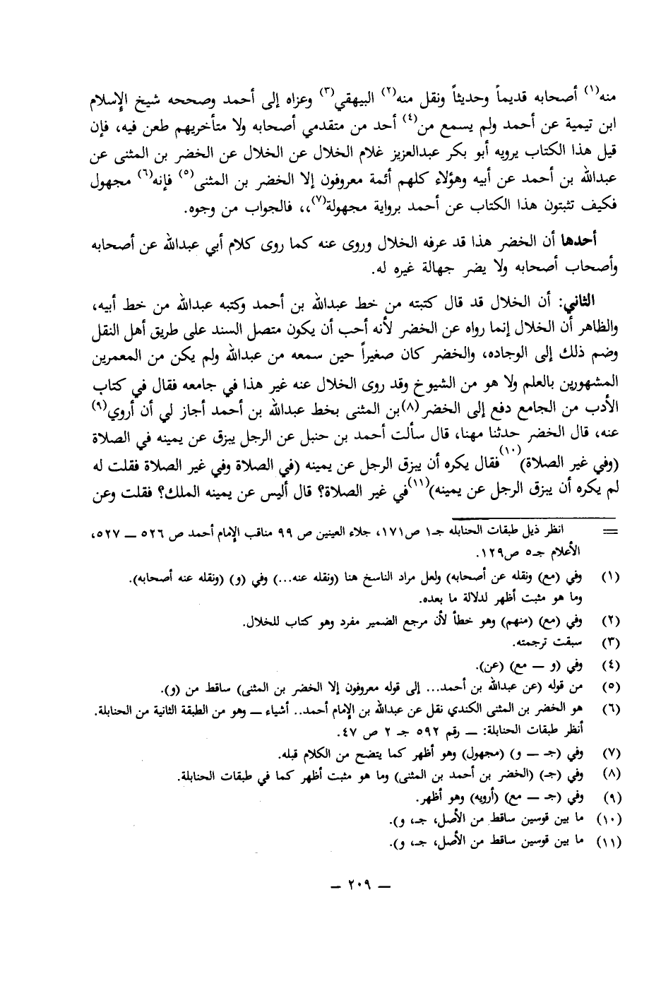 مِنْهُ أَصْحَابُهُ قَدِيمًا وَحَدِيثًا، وَنَقَلَ مِنْهُ الْبَيْهَقِيُّ وَعَزَاهُ إِلَى أَحْمَدَ وَصَحَّحَهُ شَيْخُ الْإِسْلَامِ ابْنُ تَيْمِيَّةَ عَنْ أَحْمَدَ وَلَمْ يُسْمَعْ مِنْ أَحَدٍ مِنْ مُتَقَدِّمِي أَصْحَابِهِ وَلَا مُتَأَخِّرِيهِمْ طَعْنٌ فِيهِ، فَإِنْ قِيلَ: هَذَا الْكِتَابُ يَرْوِيهِ أَبُو بَكْرٍ عَبْدُ الْعَزِيزِ غُلَامُ الْخَلَّالِ عَنِ الْخَلَّالِ عَنِ الْخَضِرِ بْنِ الْمُثَنَّى عَنْ عَبْدِ اللَّهِ بْنِ أَحْمَدَ عَنْ أَبِيهِ وَهَؤُلَاءِ كُلُّهُمْ أَئِمَّةٌ مَعْرُوفُونَ إِلَّا الْخَضِرَ بْنَ الْمُثَنَّى فَإِنَّهُ مَجْهُولٌ. فَكَيْفَ تُثْبِتُونَ هَذَا الْكِتَابَ عَنْ أَحْمَدَ بِرِوَايَةٍ مَجْهُولَةٍ، فَالْجَوَابُ مِنْ وُجُوهٍ: