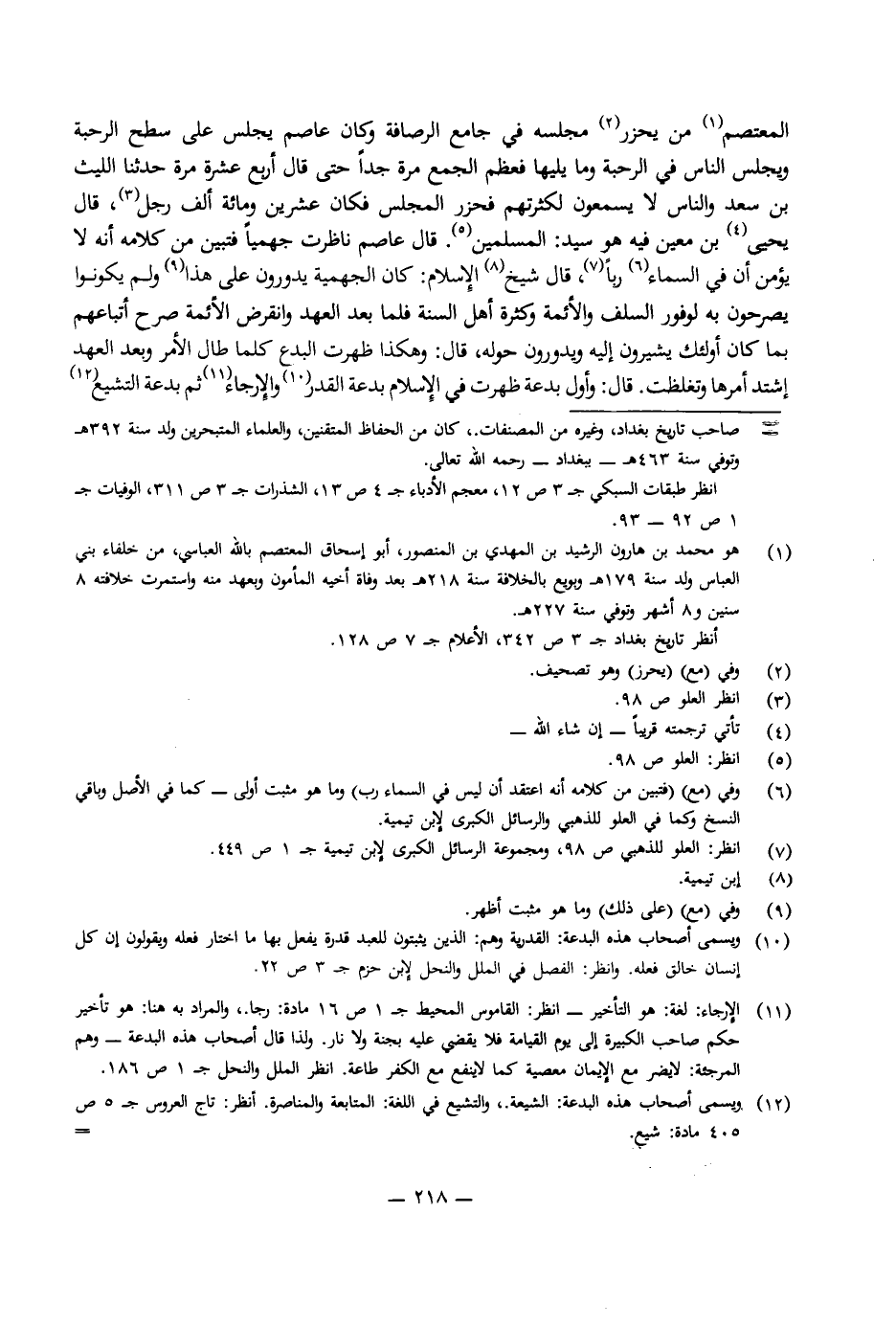 الْمُعْتَصِمُ مَنْ يَحْزَرُ مَجْلِسَهُ فِي جَامِعِ الرَّصَافَةِ وَكَانَ عَاصِمٌ يَجْلِسُ عَلَى سَطْحِ الرَّحْبَةِ وَيَجْلِسُ النَّاسُ فِي الرَّحْبَةِ وَمَا يَلِيهَا فَعَظُمَ الْجَمْعُ مَرَّةً جِدًّا حَتَّى قَالَ أَرْبَعَ عَشْرَةَ مَرَّةً حَدَّثَنَا اللَّيْثُ بْنُ سَعْدٍ وَالنَّاسُ لَا يَسْمَعُونَ لِكَثْرَتِهِمْ فَحَزَرَ الْمَجْلِسَ فَكَانَ عِشْرِينَ وَمِائَةَ أَلْفِ رَجُلٍ قَالَ يَحْيَى بْنُ مَعِينٍ فِيهِ: هُوَ سَيِّدُ الْمُسْلِمِينَ، قَالَ عَاصِمٌ: نَاظَرْتُ جَهْمِيًّا فَتَبَيَّنَ مِنْ كَلَامِهِ أَنَّهُ لَا يُؤْمِنُ أَنَّ فِي السَّمَاءِ رَبًّا، قَالَ شَيْخُ الْإِسْلَامِ: كَانَ الْجَهْمِيَّةُ يَدُورُونَ عَلَى ذَلِكَ وَلَمْ يَكُونُوا يُصَرِّحُونَ بِهِ لِوُفُورِ السَّلَفِ وَالْأَئِمَّةِ وَكَثْرَةِ أَهْلِ السُّنَّةِ فَلَمَّا بَعُدَ الْعَهْدُ وَانْقَرَضَ الْأَئِمَّةُ صَرَّحَ أَتْبَاعُهُمْ بِمَا كَانَ أُولَئِكَ يُشِيرُونَ إِلَيْهِ وَيَدُورُونَ حَوْلَهُ، قَالَ: وَهَكَذَا ظَهَرَتِ الْبِدَعُ كُلَّمَا طَالَ الْأَمْرُ وَبَعُدَ الْعَهْدُ اشْتَدَّ أَمْرُهَا وَتَغَلَّظَتْ. قَالَ: وَأَوَّلُ بِدْعَةٍ ظَهَرَتْ فِي الْإِسْلَامِ بِدْعَةُ الْقَدَرِ وَالْإِرْجَاءِ ثُمَّ بِدْعَةُ التَّشَيُّعِ