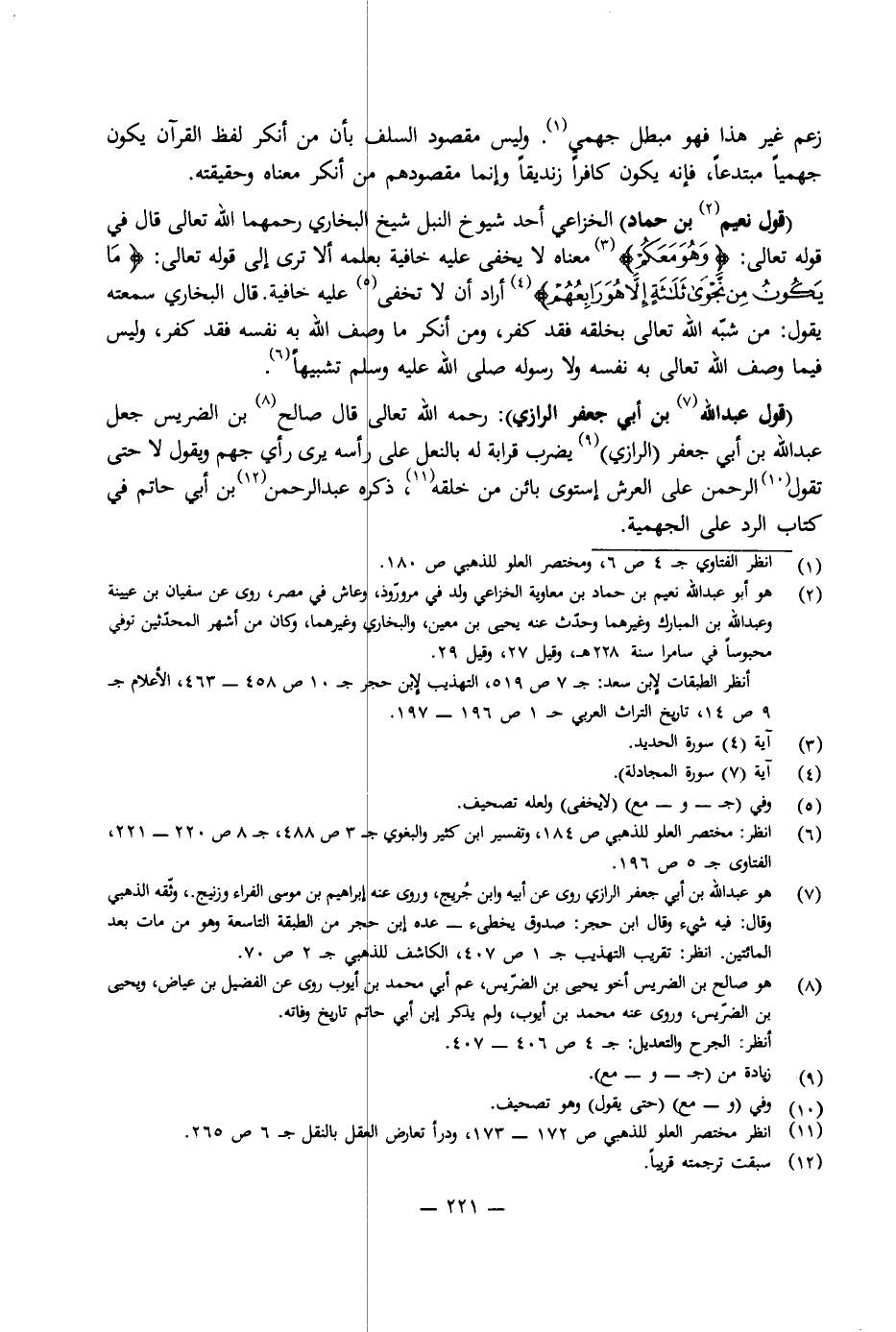 (قَوْلُ عَبْدِ اللَّهِ بْنِ أَبِي جَعْفَرٍ الرَّازِيِّ) : رَحِمَهُ اللَّهُ تَعَالَى، قَالَ صَالِحُ بْنُ الضُّرَيْسِ: جَعَلَ عَبْدُ اللَّهِ بْنُ أَبِي جَعْفَرٍ (الرَّزِايِّ) يَضْرِبُ قَرَابَةً لَهُ بِالنَّعْلِ عَلَى رَأْسِهِ يَرَى رَأْيَ جَهْمٍ وَيَقُولُ: لَا حَتَّى تَقُولَ: الرَّحْمَنُ عَلَى الْعَرْشِ اسْتَوَى بَائِنٌ مِنْ خَلْقِهِ، ذَكَرَهُ عَبْدُ الرَّحْمَنِ بْنُ أَبِي حَاتِمٍ فِي كِتَابِ الرَّدِّ عَلَى الْجَهْمِيَّةِ.