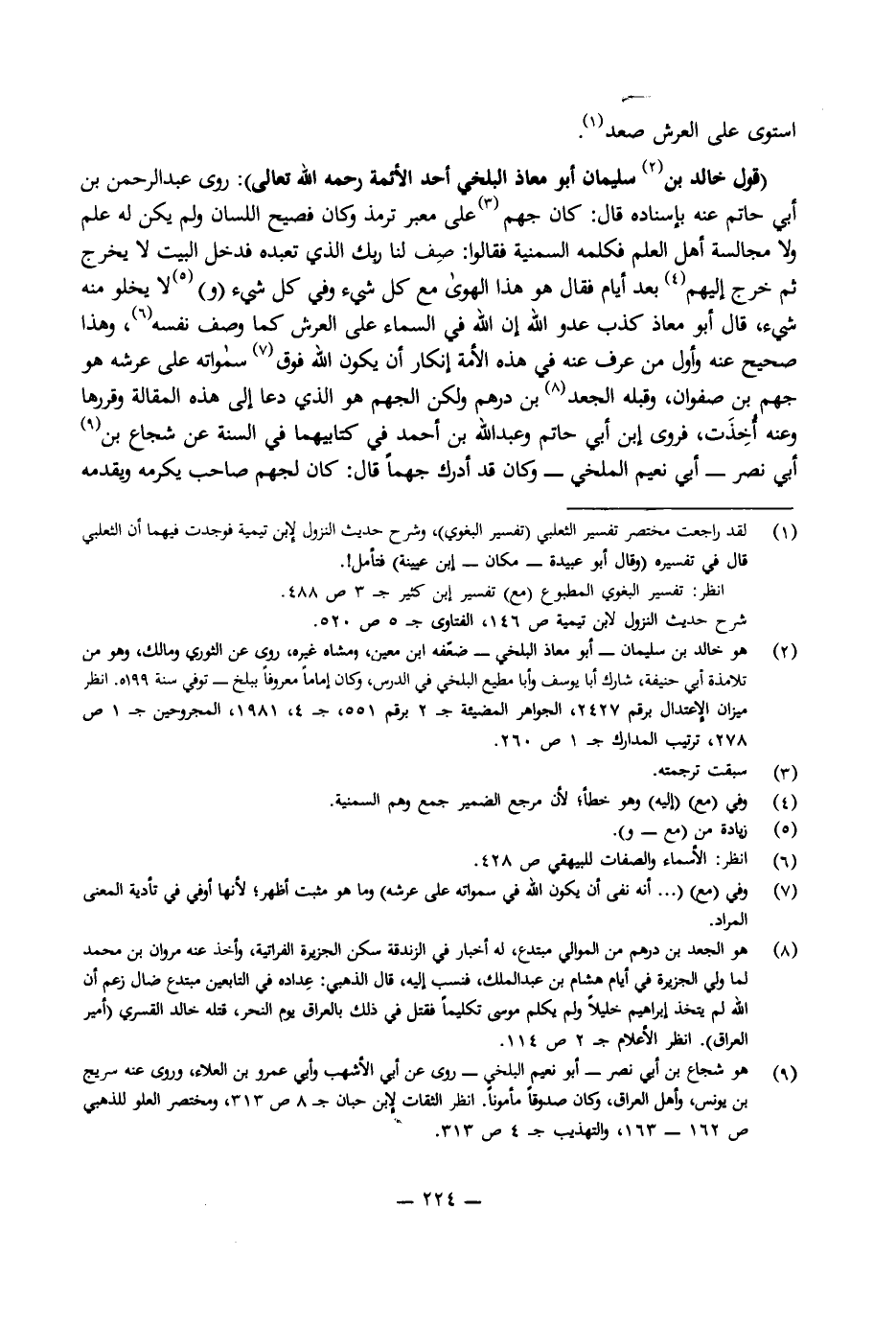 (قَوْلُ خَالِدِ بْنِ سُلَيْمَانَ أَبِي مُعَاذٍ الْبَلْخِيِّ أَحَدِ الْأَئِمَّةِ رَحِمَهُ اللَّهُ تَعَالَى) : رَوَى عَبْدُ الرَّحْمَنِ بْنُ أَبِي حَاتِمٍ عَنْهُ بِإِسْنَادِهِ قَالَ: كَانَ جَهْمٌ عَلَى مَعْبَرِ تِرْمِذَ، وَكَانَ فَصِيحَ اللِّسَانِ لَمْ يَكُنْ لَهُ عِلْمٌ وَلَا مُجَالَسَةُ أَهْلِ الْعِلْمِ، فَكَلَّمَهُ السُّمَنِيَّةُ فَقَالُوا: صِفْ لَنَا رَبَّكَ الَّذِي تَعْبُدُهُ فَدَخَلَ الْبَيْتَ لَا يَخْرُجُ ثُمَّ خَرَجَ إِلَيْهِمْ بَعْدَ أَيَّامٍ فَقَالَ: هُوَ هَذَا الْهَوَى مَعَ كُلِّ شَيْءٍ وَفِي كُلِّ شَيْءٍ (وَ) لَا يَخْلُو مِنْهُ شَيْءٌ، قَالَ أَبُو مُعَاذٍ كَذَبَ عَدُوُّ اللَّهِ إِنَّ اللَّهَ فِي السَّمَاءِ عَلَى الْعَرْشِ كَمَا وَصَفَ نَفْسَهُ، وَهَذَا صَحِيحٌ عَنْهُ وَأَوَّلُ مَنْ عُرِفَ عَنْهُ فِي هَذِهِ الْأُمَّةِ إِنْكَارُ أَنْ يَكُونَ اللَّهُ فَوْقَ سَمَاوَاتِهِ عَلَى عَرْشِهِ هُوَ جَهْمُ بْنُ صَفْوَانَ وَقَبْلَهُ الْجَعْدُ بْنُ دِرْهَمٍ، وَلَكِنَّ الْجَهْمَ هُوَ الَّذِي دَعَا إِلَى هَذِهِ الْمَقَالَةِ وَقَرَّرَهَا وَعَنْهُ أُخِذَتْ، فَرَوَى ابْنُ أَبِي حَاتِمٍ وَعَبْدُ اللَّهِ بْنُ أَحْمَدَ فِي كِتَابَيْهِمَا فِي السُّنَّةِ عَنْ شُجَاعِ بْنِ أَبِي نَصْرٍ - أَبِي نَعِيْمِ الْبَلْخِيِّ - وَكَانَ قَدْ أَدْرَكَ جَهْمًا قَالَ: كَانَ لِجَهْمٍ صَاحِبٌ يُكْرِمُهُ وَيُقَدِّمُهُ