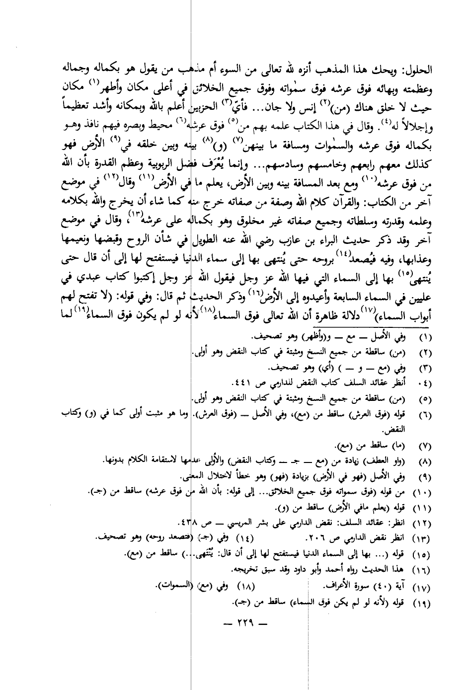 وَقَالَ فِي هَذَا الْكِتَابِ عِلْمُهُ بِهِمْ مِنْ فَوْقِ عَرْشِهِ مُحِيطٌ، وَبَصَرُهُ فِيهِمْ نَافِذٌ، وَهُوَ بِكَمَالِهِ فَوْقَ عَرْشِهِ وَالسَّمَاوَاتِ، وَمَسَافَةُ مَا بَيْنَهُنَّ وَبَيْنَهُ وَبَيْنَ خَلْقِهِ فِي الْأَرْضِ، فَهُوَ كَذَلِكَ مَعَهُمْ رَابِعُهُمْ وَخَامِسُهُمْ وَسَادِسُهُمْ. . . وَإِنَّمَا يُعْرَفُ فَضْلُ الرُّبُوبِيَّةِ وَعِظَمُ الْقُدْرَةِ بِأَنَّ اللَّهَ مِنْ فَوْقِ عَرْشِهِ وَمَعَ بُعْدِ الْمَسَافَةِ بَيْنَهُ وَبَيْنَ الْأَرْضِ يَعْلَمُ مَا فِي الْأَرْضِ، وَقَالَ فِي مَوْضِعٍ آخَرَ مِنَ الْكِتَابِ: وَالْقُرْآنُ كَلَامُ اللَّهِ وَصِفَةٌ مِنْ صِفَاتِهِ خَرَجَ مِنْهُ كَمَا شَاءَ أَنْ يَخْرُجَ وَاللَّهُ بِكَلَامِهِ وَعِلْمِهِ وَقُدْرَتِهِ وَسُلْطَانِهِ وَجَمِيعِ صِفَاتِهِ غَيْرُ مَخْلُوقٍ، وَهُوَ بِكَمَالِهِ عَلَى عَرْشِهِ، وَقَالَ فِي مَوْضِعٍ آخَرَ وَقَدْ ذَكَرَ حَدِيثَ الْبَرَاءِ بْنِ عَازِبٍ رَضِيَ اللَّهُ عَنْهُ الطَّوِيلَ فِي شَأْنِ الرُّوحِ وَقَبْضِهَا وَنَعِيمِهَا وَعَذَابِهَا، وَفِيهِ «فَيُصْعَدُ بِرُوحِهِ حَتَّى يُنْتَهَى بِهَا إِلَى سَمَاءِ الدُّنْيَا فَيُسْتَفْتَحُ لَهَا، - إِلَى أَنْ قَالَ - حَتَّى يُنْتَهَى بِهَا إِلَى السَّمَاءِ الَّتِي فِيهَا اللَّهُ عَزَّ وَجَلَّ فَيَقُولُ اللَّهُ عَزَّ وَجَلَّ: اكْتُبُوا كِتَابَ عَبْدِي فِي عِلِّيِّينَ فِي السَّمَاءِ السَّابِعَةِ وَأَعِيدُوهُ إِلَى الْأَرْضِ» - وَذَكَرَ الْحَدِيثَ - ثُمَّ قَالَ: وَفِي قَوْلِهِ: {لَا تُفَتَّحُ لَهُمْ أَبْوَابُ السَّمَاءِ} [الأعراف: 40] دَلَالَةٌ ظَاهِرَةٌ أَنَّ اللَّهَ تَعَالَى فَوْقَ السَّمَاءِ لِأَنَّهُ لَوْ لَمْ يَكُنْ فَوْقَ السَّمَاءِ لَمَا