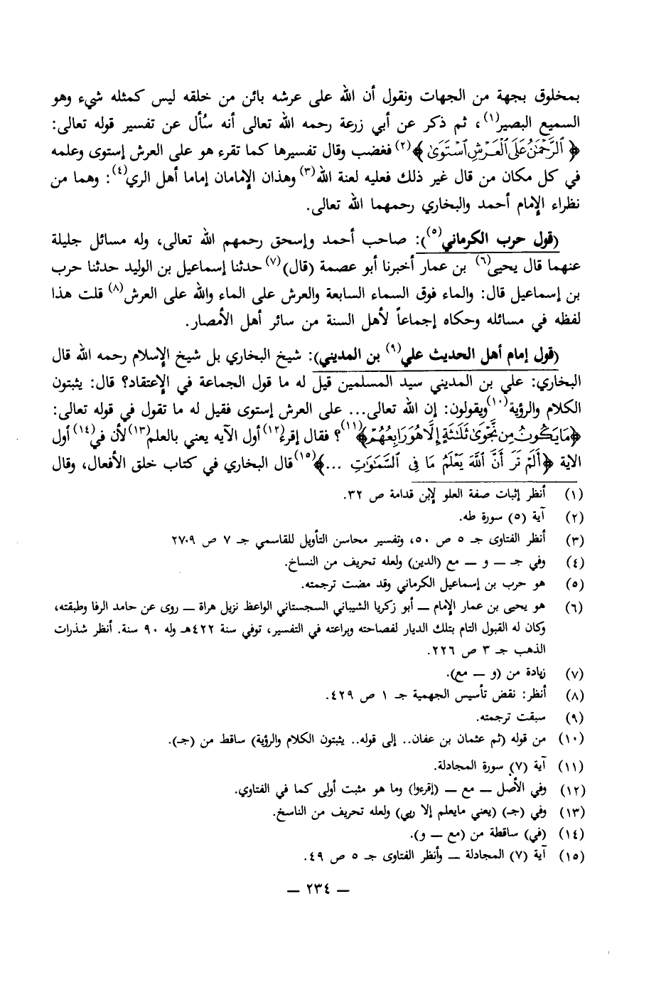 (قَوْلُ إِمَامِ أَهْلِ الْحَدِيثِ عَلِيِّ بْنِ الْمَدِينِيِّ) : شَيْخِ الْبُخَارِيِّ بَلْ شَيْخُ الْإِسْلَامِ رَحِمَهُ اللَّهُ قَالَ الْبُخَارِيُّ: عَلِيُّ بْنُ الْمَدِينِيِّ سَيِّدُ الْمُسْلِمِينَ قِيلَ لَهُ: مَا قَوْلُ الْجَمَاعَةِ فِي الِاعْتِقَادِ؟ قَالَ يُثْبِتُونَ الْكَلَامَ وَالرُّؤْيَةَ وَيَقُولُونَ: إِنَّ اللَّهَ تَعَالَى. . . عَلَى الْعَرْشِ اسْتَوَى، فَقِيلَ لَهُ: مَا تَقُولُ فِي قَوْلِهِ تَعَالَى: {مَا يَكُونُ مِنْ نَجْوَى ثَلَاثَةٍ إِلَّا هُوَ رَابِعُهُمْ} [المجادلة: 7] ؟ فَقَالَ: اقْرَأْ أَوَّلَ الْآيَةِ يَعْنِي بِالْعِلْمِ لِأَنَّ فِي أَوَّلِ الْآيَةِ: {أَلَمْ تَرَ أَنَّ اللَّهَ يَعْلَمُ مَا فِي السَّمَاوَاتِ} [المجادلة: 7] . . . قَالَ الْبُخَارِيُّ فِي كِتَابِ خَلْقِ الْأَفْعَالِ، وَقَالَ