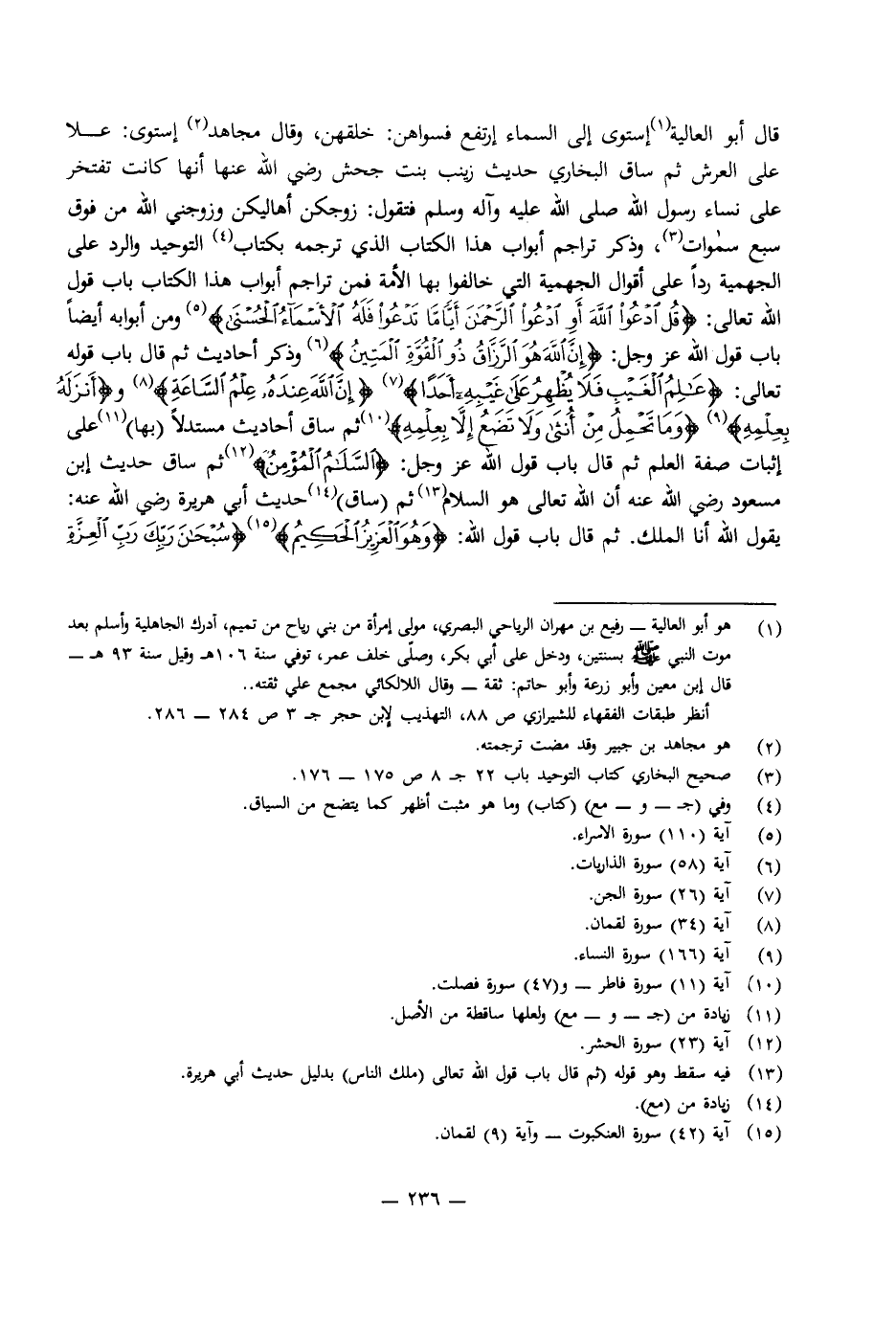 قَالَ أَبُو الْعَالِيَةِ اسْتَوَى إِلَى السَّمَاءِ ارْتَفَعَ فَسَوَّاهُنَّ: خَلَقَهُنَّ، وَقَالَ مُجَاهِدٌ: اسْتَوَى: عَلَا عَلَى الْعَرْشِ ثُمَّ سَاقَ الْبُخَارِيُّ حَدِيثَ زَيْنَبَ بِنْتِ جَحْشٍ رَضِيَ اللَّهُ عَنْهَا أَنَّهَا كَانَتْ تَفْتَخِرُ عَلَى نِسَاءِ رَسُولِ اللَّهِ صَلَّى اللَّهُ عَلَيْهِ وَآلِهِ وَسَلَّمَ فَتَقُولُ: زَوَّجَكُنَّ أَهَالِيكُنَّ وَزَوَّجَنِي اللَّهُ مِنْ فَوْقِ سَبْعِ سَمَاوَاتٍ، وَذَكَرَ تَرَاجِمَ أَبْوَابِ هَذَا الْكِتَابِ الَّذِي تَرْجَمَهُ بِكِتَابِ التَّوْحِيدِ وَالرَّدِّ عَلَى الْجَهْمِيَّةِ رَدًّا عَلَى أَقْوَالِ الْجَهْمِيَّةِ الَّتِي خَالَفُوا بِهَا الْأُمَّةَ فَمِنْ تَرَاجِمِ أَبْوَابِ هَذَا الْكِتَابِ بَابُ قَوْلِ اللَّهِ تَعَالَى: {قُلِ ادْعُوا اللَّهَ أَوِ ادْعُوا الرَّحْمَنَ أَيًّا مَا تَدْعُوا فَلَهُ الْأَسْمَاءُ الْحُسْنَى} [الإسراء: 110] . وَمِنْ أَبْوَابِهِ أَيْضًا بَابُ قَوْلِ اللَّهِ عَزَّ وَجَلَّ: {إِنَّ اللَّهَ هُوَ الرَّزَّاقُ ذُو الْقُوَّةِ الْمَتِينُ} [الذاريات: 58] وَذَكَرَ أَحَادِيثَ، ثُمَّ قَالَ: بَابُ قَوْلِهِ تَعَالَى: {عَالِمُ الْغَيْبِ فَلَا يُظْهِرُ عَلَى غَيْبِهِ أَحَدًا} [الجن: 26] ، {إِنَّ اللَّهَ عِنْدَهُ عِلْمُ السَّاعَةِ} [لقمان: 34] ، وَ {أَنْزَلَهُ بِعِلْمِهِ} [النساء: 166] {وَمَا تَحْمِلُ مِنْ أُنْثَى وَلَا تَضَعُ إِلَّا بِعِلْمِهِ} [فاطر: 11] ثُمَّ سَاقَ أَحَادِيثَ مُسْتَدِلًّا (بِهَا) عَلَى إِثْبَاتِ صِفَةِ الْعِلْمِ، ثُمَّ قَالَ: بَابُ قَوْلِ اللَّهِ عَزَّ وَجَلَّ: {السَّلَامُ الْمُؤْمِنُ} [الحشر: 23] ثُمَّ سَاقَ حَدِيثَ ابْنِ مَسْعُودٍ رَضِيَ اللَّهُ عَنْهُ «أَنَّ اللَّهَ تَعَالَى هُوَ السَّلَامُ» ثُمَّ (سَاقَ) حَدِيثَ أَبِي هُرَيْرَةَ رَضِيَ اللَّهُ عَنْهُ: «يَقُولُ اللَّهُ: أَنَا الْمَلِكُ» . ثُمَّ قَالَ: بَابُ قَوْلِ اللَّهِ: (وَهُوَ الْعَزِيزُ الْحَكِيمُ) ، {سُبْحَانَ رَبِّكَ رَبِّ الْعِزَّةِ عَمَّا يَصِفُونَ} [الصافات: 180]