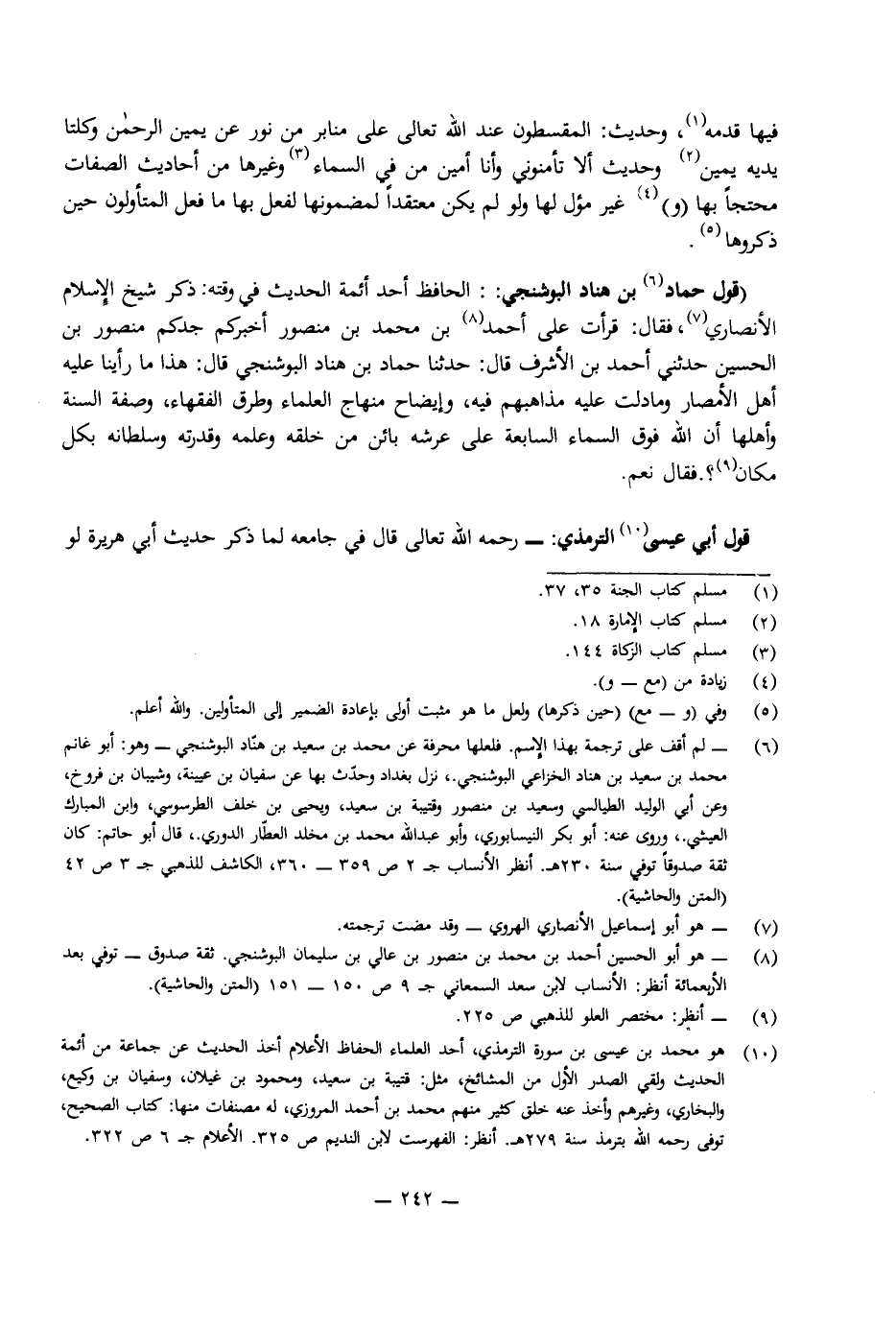 (قَوْلُ حَمَّادِ بْنِ هَنَّادٍ الْبُوشْنَجِيِّ) : الْحَافِظِ أَحَدِ أَئِمَّةِ الْحَدِيثِ فِي وَقْتِهِ: ذَكَرَ شَيْخُ الْإِسْلَامِ الْأَنْصَارِيُّ، فَقَالَ: قَرَأْتُ عَلَى أَحْمَدَ بْنِ مُحَمَّدِ بْنِ مَنْصُورٍ أَخْبَرَكُمْ جَدُّكُمْ مَنْصُورُ بْنُ الْحُسَيْنِ حَدَّثَنِي أَحْمَدُ بْنُ الْأَشْرَفِ قَالَ: حَدَّثَنَا حَمَّادُ بْنُ هَنَّادِ الْبُوشْنَجِيُّ قَالَ: هَذَا مَا رَأَيْنَا عَلَيْهِ أَهْلَ الْأَمْصَارِ وَمَا دَلَّتْ عَلَيْهِ مَذَاهِبُهُمْ فِيهِ، وَإِيضَاحُ مِنْهَاجِ الْعُلَمَاءِ وَطُرُقِ الْفُقَهَاءِ، وَصِفَةِ السُّنَّةِ وَأَهْلِهَا أَنَّ اللَّهَ فَوْقَ السَّمَاءِ السَّابِعَةِ عَلَى عَرْشِهِ بَائِنٌ مِنْ خَلْقِهِ وَعَلِمِهُ وَقُدْرَتِهِ وَسُلْطَانِهِ بِكُلِّ مَكَانٍ؟ فَقَالَ: نَعَمْ.