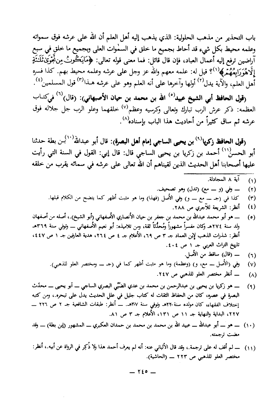 (قَوْلُ الْحَافِظِ أَبِي الشَّيْخِ عُبَيْدِ اللَّهِ بْنِ مُحَمَّدِ بْنِ حَيَّانَ الْأَصْبِهَانِيِّ) : (قَالَ) فِي كِتَابِ الْعَظَمَةِ: ذَكَرَ عَرْشَ الرَّبِّ تَبَارَكَ وَتَعَالَى وَكُرْسِيَّهُ وَعِظَمَ خَلْقِهِمَا وَعُلُوَّ الرَّبِّ جَلَّ جَلَالُهُ فَوْقَ عَرْشِهِ ثُمَّ سَاقَ كَثِيرًا مِنْ أَحَادِيثِ هَذَا الْبَابِ بِإِسْنَادِهِ.