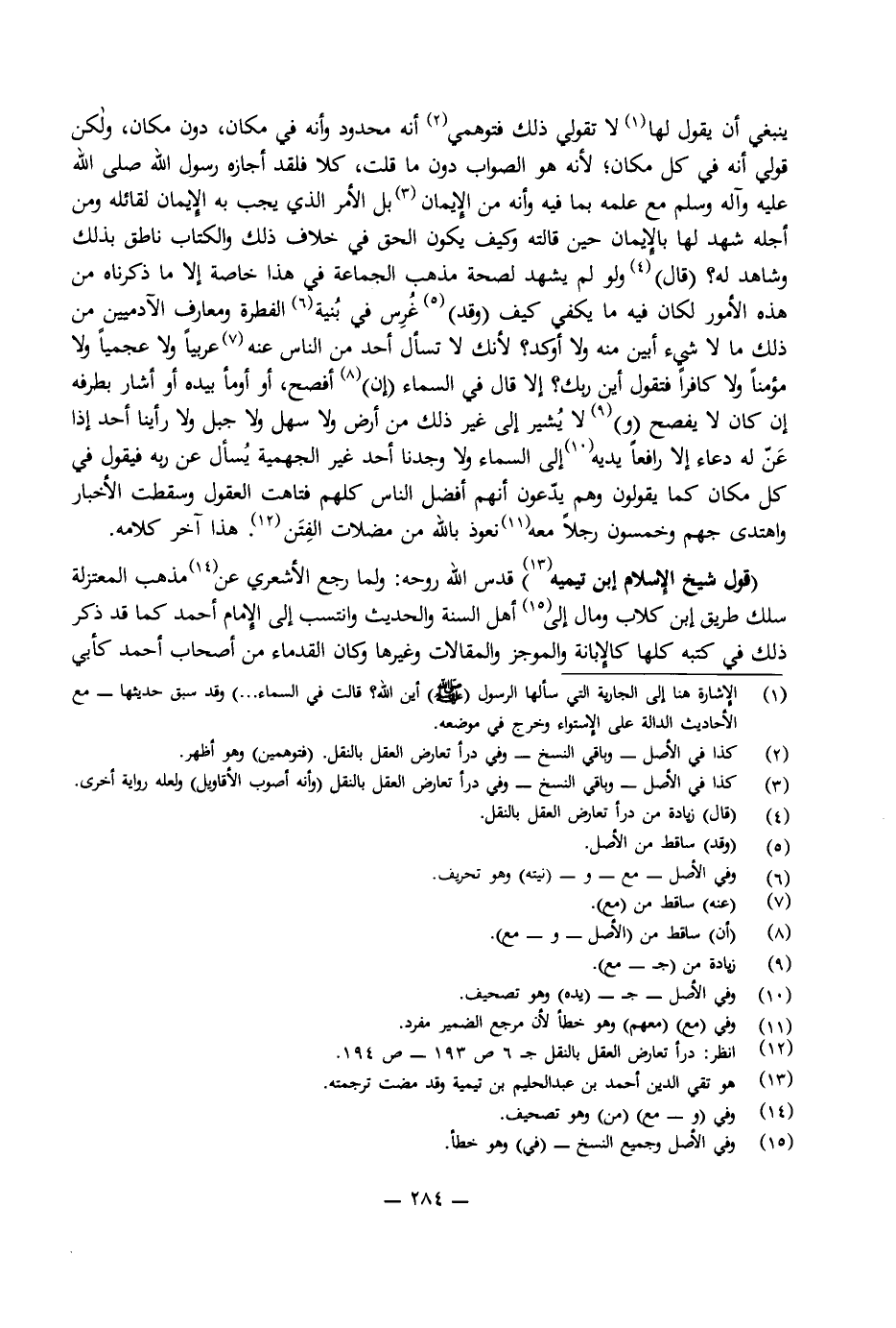 يَنْبَغِي أَنْ يَقُولَ لَهَا لَا تَقُولِي ذَلِكَ، فَتَوَهَّمِي أَنَّهُ مَحْدُودٌ وَأَنَّهُ فِي مَكَانٍ دُونَ مَكَانٍ، وَلَكِنْ قُولِي: إِنَّهُ فِي كُلِّ مَكَانٍ ; لِأَنَّهُ هُوَ الصَّوَابُ دُونَ مَا قُلْتِ، كَلَّا فَلَقَدْ أَجَازَهُ رَسُولُ اللَّهِ صَلَّى اللَّهُ عَلَيْهِ وَآلِهِ وَسَلَّمَ مَعَ عِلْمِهِ بِمَا فِيهِ وَأَنَّهُ مِنَ الْإِيمَانِ بَلِ الْأَمْرُ الَّذِي يَجِبُ بِهِ الْإِيمَانُ لِقَائِلِهِ وَمِنْ أَجْلِهِ شَهِدَ لَهَا بِالْإِيمَانِ حِينَ قَالَتْهُ. وَكَيْفَ يَكُونُ الْحَقُّ فِي خِلَافِ ذَلِكَ وَالْكِتَابُ نَاطِقٌ بِذَلِكَ وَشَاهِدٌ لَهُ؟ (قَالَ) وَلَوْ لَمْ يَشْهَدْ لِصِحَّةِ مَذْهَبِ الْجَمَاعَةِ فِي هَذَا خَاصَّةً إِلَّا مَا ذَكَرْنَاهُ مِنْ هَذِهِ الْأُمُورِ لَكَانَ فِيهِ مَا يَكْفِي كَيْفَ (وَقَدْ) غُرِسَ فِي بِنْيَةِ الْفِطْرَةِ وَمَعَارِفِ الْآدَمِيِّينَ مِنْ ذَلِكَ مَا لَا شَيْءَ أَبْيَنَ مِنْهُ وَلَا أَوْكَدَ؟ لِأَنَّكَ لَا تَسْأَلُ أَحَدًا مِنَ النَّاسِ عَنْهُ عَرَبِيًّا وَلَا عَجَمِيًّا وَلَا مُؤْمِنًا وَلَا كَافِرًا فَتَقُولُ أَيْنَ رَبُّكَ؟ إِلَّا قَالَ: فِي السَّمَاءِ (إِنْ) أَفْصَحَ، أَوْ أَوْمَأَ بِيَدِهِ أَوْ أَشَارَ بِطَرْفِهِ إِنْ كَانَ لَا يُفْصِحُ وَلَا يُشِيرُ إِلَى غَيْرِ ذَلِكَ مِنْ أَرْضٍ وَلَا سَهْلٍ وَلَا جَبَلٍ، وَلَا رَأَيْنَا أَحَدًا إِذَا عَنَّ لَهُ دُعَاءٌ إِلَّا رَافِعًا يَدَيْهِ إِلَى السَّمَاءِ وَلَا وَجَدْنَا أَحَدًا غَيْرَ الْجَهْمِيَّةِ يَسْأَلُ عَنْ رَبِّهِ فَيَقُولُ: فِي كُلِّ مَكَانٍ كَمَا يَقُولُونَ وَهُمْ يَدَّعُونَ أَنَّهُمْ أَفْضَلُ النَّاسِ كُلِّهِمْ فَتَاهَتِ الْعُقُولُ وَسَقَطَتِ الْأَخْبَارُ وَاهْتَدَى جَهْمٌ وَخَمْسُونَ رَجُلًا مَعَهُمْ نُعُوذُ بِاللَّهِ مِنْ مُضِلَّاتِ الْفِتَنِ. هَذَا آخِرُ كَلَامِهِ.