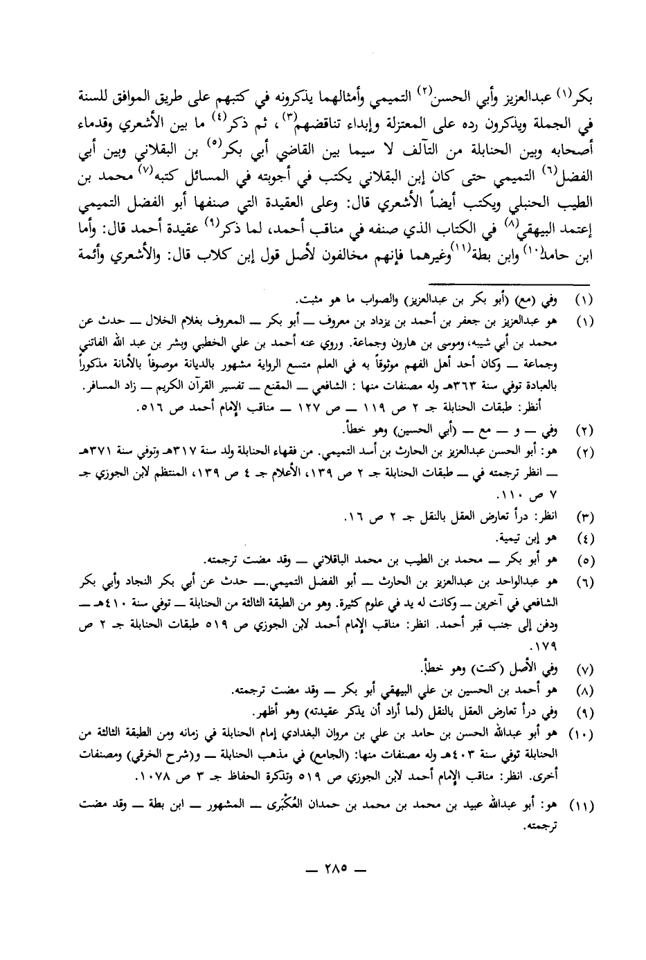 بَكْرِ بْنِ عَبْدِ الْعَزِيزِ وَأَبِي الْحُسَيْنِ التَّمِيمِيِّ وَأَمْثَالِهِمَا يَذْكُرُونَهُ فِي كُتُبِهِمْ عَلَى طَرِيقِ الْمُوَافِقِ لِلسُّنَّةِ فِي الْجُمْلَةِ وَيَذْكُرُونَ رَدَّهُ عَلَى الْمُعْتَزِلَةِ وَأَبْدَى تُنَاقُضَهُمْ، ثُمَّ ذَكَرَ مَا بَيْنَ الْأَشْعَرِيِّ وَقُدَمَاءِ أَصْحَابِهِ وَبَيْنَ الْحَنَابِلَةِ مِنَ التَّآلُفِ، لَاسِيَّمَا بَيْنَ الْقَاضِي أَبِي بَكْرِ بْنِ الْبَاقِلَّانِيِّ وَبَيْنَ أَبِي الْفَضْلِ بْنِ التَّمِيمِيِّ، حَتَّى كَانَ ابْنُ الْبَاقِلَّانِيِّ يَكْتُبُ فِي أَجْوِبَتِهِ فِي الْمَسَائِلِ كَتَبَهُ مُحَمَّدُ بْنُ الطَّيِّبِ الْحَنْبَلِيُّ وَيَكْتُبُ أَيْضًا الْأَشْعَرِيَّ قَالَ: وَعَلَى الْعَقِيدَةِ الَّتِي صَنَّفَهَا أَبُو الْفَضْلِ التَّمِيمِيُّ اعْتَمَدَ الْبَيْهَقِيُّ فِي الْكِتَابِ الَّذِي صَنَّفَهُ فِي مَنَاقِبِ أَحْمَدَ، لَمَّا ذَكَرَ عَقِيدَةَ أَحْمَدَ قَالَ: وَأَمَّا ابْنُ حَامِدٍ وَابْنُ بَطَّةَ وَغَيْرُهُمَا فَإِنَّهُمْ مُخَالِفُونَ لِأَصْلِ قَوْلِ ابْنِ كِلَابٍ قَالَ: وَالْأَشْعَرِيُّ وَأَئِمَّةُ