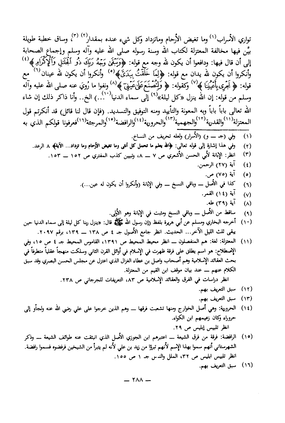 تُوَارِي الْأَسْرَابُ وَمَا تَغِيضُ الْأَرْحَامُ وَمَا تَزْدَادُ وَكُلُّ شَيْءٍ عِنْدَهُ بِمِقْدَارٍ، وَسَاقَ خُطْبَةً طَوِيلَةً بَيَّنَ فِيهَا مُخَالَفَةَ الْمُعْتَزِلَةِ لِكِتَابِ اللَّهِ وَسُنَّةِ رَسُولِهِ صَلَّى اللَّهُ عَلَيْهِ وَآلِهِ وَسَلَّمَ وَإِجْمَاعِ الصَّحَابَةِ إِلَى أَنْ قَالَ فِيهَا: وَدَافَعُوا أَنْ يَكُونَ لِلَّهِ وَجْهٌ مَعَ قَوْلِهِ: {وَيَبْقَى وَجْهُ رَبِّكَ ذُو الْجَلَالِ وَالْإِكْرَامِ} [الرحمن: 27] وَأَنْكَرُوا أَنْ يَكُونَ لِلَّهِ يَدَانِ مَعَ قَوْلِهِ: {لِمَا خَلَقْتُ بِيَدَيَّ} [ص: 75] وَأَنْكَرُوا أَنْ يَكُونَ لِلَّهِ عَيْنَانِ مَعَ قَوْلِهِ: {تَجْرِي بِأَعْيُنِنَا} [القمر: 14] وَكَقَوْلِهِ: {وَلِتُصْنَعَ عَلَى عَيْنِي} [طه: 39] وَنَفَوْا مَا رُوِيَ عَنْهُ صَلَّى اللَّهُ عَلَيْهِ وَآلِهِ وَسَلَّمَ مِنْ قَوْلِهِ: «إِنَّ اللَّهَ يَنْزِلُ " كُلَّ لَيْلَةٍ " إِلَى سَمَاءِ الدُّنْيَا» . . . إِلَخْ وَأَنَا ذَاكِرٌ ذَلِكَ إِنْ شَاءَ اللَّهُ تَعَالَى بَابًا بَابًا وَبِهِ الْمَعُونَةُ وَالتَّأْيِيدُ وَمِنْهُ التَّوْفِيقُ وَالتَّسْدِيدُ. (فَإِنْ قَالَ لَنَا قَائِلٌ) قَدْ أَنْكَرْتُمْ قَوْلَ الْمُعْتَزِلَةِ وَالْقَدَرِيَّةِ وَالْجَهْمِيَّةِ وَالْحَرُورِيَّةِ وَالرَّافِضَةِ وَالْمُرْجِئَةِ فَعَرِّفُونَا قَوْلَكُمُ الَّذِي بِهِ