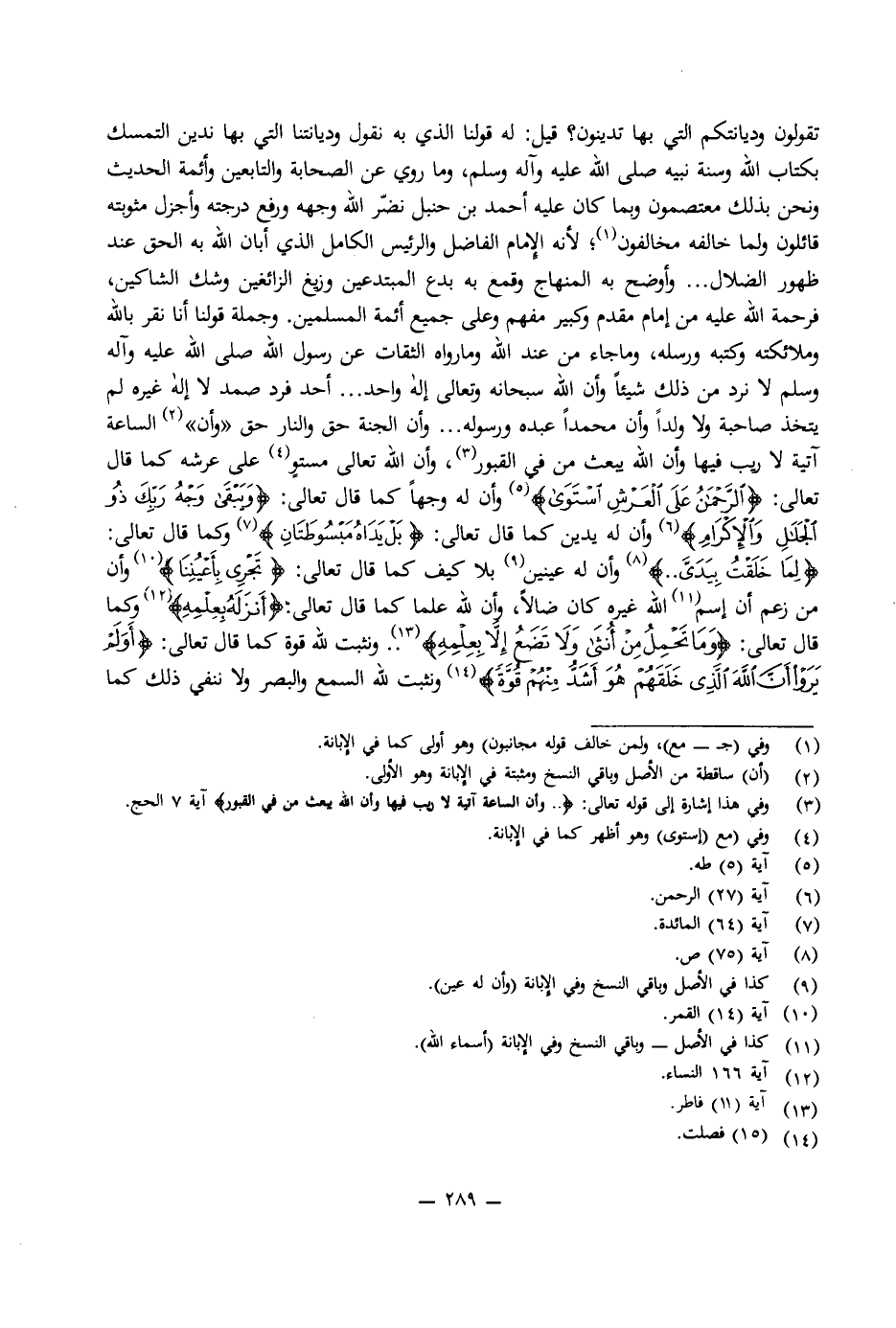 تَقُولُونَ؟ وَدِيَانَتَكُمُ الَّتِي بِهَا تَدِينُونَ؟ قِيلَ لَهُ: قَوْلُنَا الَّذِي بِهِ نَقُولُ وَدِيَانَتُنَا الَّتِي بِهَا نَدِينُ الْتَمَسَكُ بِكِتَابِ اللَّهِ وَسُنَّةِ نَبِيِّهِ صَلَّى اللَّهُ عَلَيْهِ وَآلِهِ وَسَلَّمَ وَمَا رُوِيَ عَنِ الصَّحَابَةِ وَالتَّابِعِينَ وَأَئِمَّةِ الْحَدِيثِ وَنَحْنُ بِذَلِكَ مُعْتَصِمُونَ وَبِمَا كَانَ عَلَيْهِ أَحْمَدُ بْنُ حَنْبَلٍ نَضَّرَ اللَّهُ وَجْهَهُ وَرَفَعَ دَرَجَتَهُ وَأَجْزَلَ مَثُوبَتَهُ قَائِلُونَ وَلِمَنْ خَالَفَهُ مُخَالِفُونَ ; لِأَنَّهُ الْإِمَامُ الْفَاضِلُ وَالرَّئِيسُ الْكَامِلُ الَّذِي أَبَانَ اللَّهُ بِهِ الْحَقَّ عِنْدَ ظُهُورِ الضَّلَالِ وَأَوْضَحَ بِهِ الْمِنْهَاجَ وَقَمَعَ بِهِ بِدَعَ الْمُبْتَدِعِينَ وَزَيْغَ الزَّائِغَيْنِ وَشَكَّ الشَّاكِّينَ، فَرَحْمَةُ اللَّهِ عَلَيْهِ مِنْ إِمَامٍ مُقَدَّمٍ وَكَبِيرٍ مُفَهَّمٍ وَعَلَى جَمِيعِ أَئِمَّةِ الْمُسْلِمِينَ. وَجُمْلَةُ قَوْلِنَا أَنَّا نُقِرُّ بِاللَّهِ وَمَلَائِكَتِهِ وَكُتُبِهِ وَرُسُلِهِ، وَمَا جَاءَ مِنْ عِنْدِ اللَّهِ وَمَا رَوَاهُ الثِّقَاتُ عَنْ رَسُولِ اللَّهِ صَلَّى اللَّهُ عَلَيْهِ وَآلِهِ وَسَلَّمَ لَا نَرُدُّ مِنْ ذَلِكَ شَيْئًا وَأَنَّ اللَّهَ سُبْحَانَهُ وَتَعَالَى إِلَهٌ وَاحِدٌ. أَحَدٌ فَرْدٌ صَمَدٌ لَا إِلَهَ غَيْرُهُ لَمْ يَتَّخِذْ صَاحِبَةً وَلَا وَلَدًا وَأَنَّ مُحَمَّدًا عَبْدُهُ وَرَسُولُهُ. . وَأَنَّ الْجَنَّةَ حَقٌّ وَالنَّارَ حَقٌّ " وَأَنَّ " السَّاعَةَ آتِيَةٌ لَا رَيْبَ فِيهَا وَأَنَّ اللَّهَ يَبْعَثُ مَنْ فِي الْقُبُورِ، وَأَنَّ اللَّهَ تَعَالَى اسْتَوَى عَلَى عَرْشِهِ كَمَا قَالَ تَعَالَى: {الرَّحْمَنُ عَلَى الْعَرْشِ اسْتَوَى} [طه: 5] وَأَنَّ لَهُ وَجْهًا كَمَا قَالَ تَعَالَى: {وَيَبْقَى وَجْهُ رَبِّكَ ذُو الْجَلَالِ وَالْإِكْرَامِ} [الرحمن: 27] وَأَنَّ لَهُ يَدَيْنِ كَمَا قَالَ تَعَالَى: {بَلْ يَدَاهُ مَبْسُوطَتَانِ} [المائدة: 64] وَكَمَا قَالَ تَعَالَى: {لِمَا خَلَقْتُ بِيَدَيَّ} [ص: 75] وَأَنَّ لَهُ عَيْنَيْنِ بِلَا كَيْفٍ كَمَا قَالَ تَعَالَى: {تَجْرِي بِأَعْيُنِنَا} [القمر: 14] وَأَنَّ مَنْ زَعَمَ أَنَّ اسْمَ اللَّهِ غَيْرُهُ كَانَ ضَالًّا، وَأَنْ لِلَّهِ عِلْمًا كَمَا قَالَ تَعَالَى: {أَنْزَلَهُ بِعِلْمِهِ} [النساء: 166] وَكَمَا قَالَ تَعَالَى: {وَمَا تَحْمِلُ مِنْ أُنْثَى وَلَا تَضَعُ إِلَّا بِعِلْمِهِ} [فاطر: 11] وَنَثْبِتُ لِلَّهِ قُوَّةً كَمَا قَالَ تَعَالَى: {أَوَلَمْ يَرَوْا أَنَّ اللَّهَ الَّذِي خَلَقَهُمْ هُوَ أَشَدُّ مِنْهُمْ قُوَّةً} [فصلت: 15] وَنُثْبِتُ لِلَّهِ السَّمْعَ وَالْبَصَرَ، وَلَا نَنْفِي ذَلِكَ كَمَا