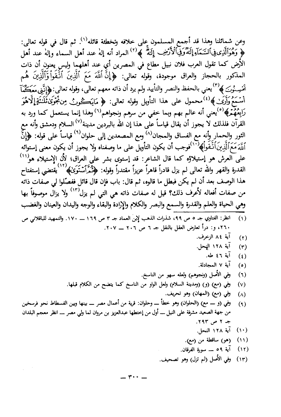 وَعَنْ شَمَائِلِنَا، وَهَذَا قَدْ أَجْمَعَ الْمُسْلِمُونَ عَلَى خِلَافِهِ وَتَخْطِئَةِ قَائِلِهِ. ثُمَّ قَالَ فِي قَوْلِهِ تَعَالَى: {وَهُوَ الَّذِي فِي السَّمَاءِ إِلَهٌ وَفِي الْأَرْضِ إِلَهٌ} [الزخرف: 84] الْمُرَادُ: أَنَّهُ إِلَهٌ عِنْدَ أَهْلِ السَّمَاءِ وَإِلَهٌ عِنْدَ أَهْلِ الْأَرْضِ كَمَا تَقُولُ الْعَرَبُ: فُلَانٌ نَبِيلٌ مُطَاعٌ فِي الْمُصْرَيْنِ أَيْ عِنْدِ أَهْلِهِمَا وَلَيْسَ يَعْنُونَ أَنَّ ذَاتَ الْمَذْكُورِ بِالْحِجَازِ وَالْعِرَاقِ مَوْجُودَةٌ، وَقَوْلُهُ تَعَالَى: {إِنَّ اللَّهَ مَعَ الَّذِينَ اتَّقَوْا وَالَّذِينَ هُمْ مُحْسِنُونَ} [النحل: 128] يَعْنِي: بِالْحِفْظِ وَالنَّصْرِ وَالتَّأْيِيدِ وَلَمْ يُرِدْ أَنْ ذَاتَهُ مَعَهُمْ تَعَالَى، وَقَوْلُهُ تَعَالَى: {إِنَّنِي مَعَكُمَا أَسْمَعُ وَأَرَى} [طه: 46] مَحْمُولٌ عَلَى هَذَا التَّأْوِيلِ، وَقَوْلُهُ تَعَالَى: {مَا يَكُونُ مِنْ نَجْوَى ثَلَاثَةٍ إِلَّا هُوَ رَابِعُهُمْ} [المجادلة: 7] يَعْنِي: أَنَّهُ عَالِمٌ بِهِمْ وَبِمَا خَفِيَ مِنْ سِرِّهِمْ وَنَجْوَاهُمْ وَهَذَا إِنَّمَا يُسْتَعْمَلُ كَمَا وَرَدَ بِهِ الْقُرْآنُ فَلِذَلِكَ لَا يَجُوزُ أَنْ يُقَالَ قِيَاسًا عَلَى هَذَا: إِنَّ اللَّهَ بِالْبَرْدَيْنِ مَدِينَةِ السَّلَامِ وَدِمَشْقَ، وَأَنَّهُ مَعَ الثَّوْرِ وَالْحِمَارِ وَأَنَّهُ مَعَ الْفُسَّاقِ وَالْمُجَّانِ وَمَعَ الْمُصْعَدِينَ إِلَى حُلْوَانَ قِيَاسًا عَلَى قَوْلِهِ: {إِنَّ اللَّهَ مَعَ الَّذِينَ اتَّقَوْا} [النحل: 128] فَوَجَبَ أَنْ يَكُونَ التَّأْوِيلُ عَلَى مَا وَصَفْنَاهُ وَلَا يَجُوزُ أَنْ يَكُونَ مَعْنَى اسْتِوَائِهِ عَلَى الْعَرْشِ هُوَ اسْتِيلَاؤُهُ كَمَا قَالَ الشَّاعِرُ:
