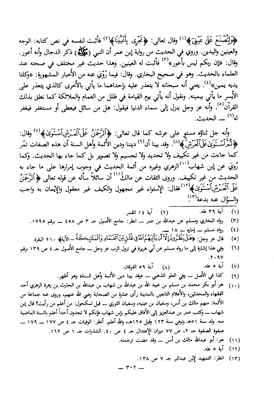 وَأَنَّهُ جَلَّ ثَنَاؤُهُ مُسْتَوٍ عَلَى عَرْشِهِ كَمَا قَالَ تَعَالَى: {الرَّحْمَنُ عَلَى الْعَرْشِ اسْتَوَى} [طه: 5] ، وَقَالَ: {ثُمَّ اسْتَوَى عَلَى الْعَرْشِ} [الأعراف: 54] ، وَقَدْ بَيَّنَّا أَنَّ دِينَنَا وَدِينَ الْأَئِمَّةِ وَأَهْلِ السُّنَّةِ أَنَّ هَذِهِ الصِّفَاتِ تَمُرُّ كَمَا جَاءَتْ مِنْ غَيْرِ تَكْيِيفٍ وَلَا تَحْدِيدٍ، وَلَا تَجْسِيمٍ، وَلَا تَصْوِيرٍ، بَلْ كَمَا جَاءَ بِهَا الْحَدِيثُ، وَكَمَا رُوِيَ عَنِ ابْنِ شِهَابِ الزُّهْرِيِّ وَغَيْرِهِ مِنْ أَئِمَّةِ الْحَدِيثِ فِي وُجُوبِ إِمْرَارِهَا عَلَى مَا جَاءَ بِهِ الْحَدِيثُ مِنْ غَيْرِ تَكْيِيفٍ. وَرَوَى الثِّقَاتُ عَنْ مَالِكٍ أَنَّ سَائِلًا سَأَلَهُ عَنْ قَوْلِهِ تَعَالَى: الرَّحْمَنُ عَلَى الْعَرْشِ اسْتَوَى، فَقَالَ: الِاسْتِوَاءُ غَيْرُ مَجْهُولٍ، وَالْكَيْفُ غَيْرُ مَعْقُولٍ، وَالْإِيمَانُ بِهِ وَاجِبٌ، وَالسُّؤَالُ عَنْهُ بِدْعَةٌ.