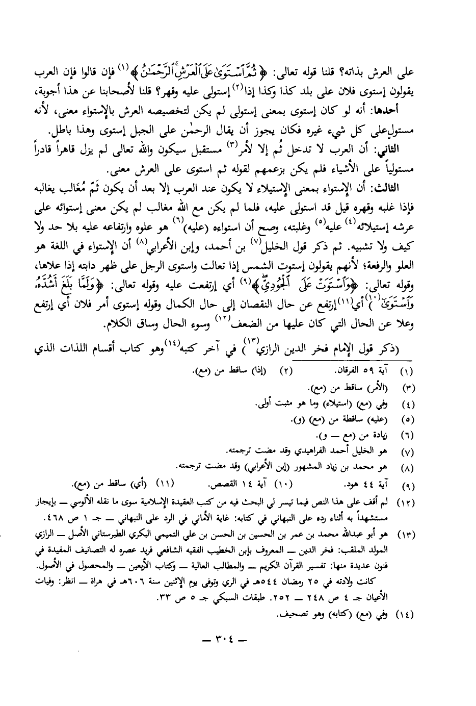 الثَّالِثُ: أَنَّ الِاسْتِوَاءَ بِمَعْنَى الِاسْتِيلَاءِ لَا يَكُونُ عِنْدَ الْعَرَبِ إِلَّا بَعْدَ أَنْ يَكُونَ، ثُمَّ مُغَالِبٌ يُغَالِبُهُ فَإِذَا غَلَبَهُ وَقَهَرَهُ قِيلَ: قَدِ اسْتَوْلَى عَلَيْهِ، فَلَمَّا لَمْ يَكُنْ مَعَ اللَّهِ مُغَالِبٌ لَمْ يَكُنْ مَعْنَى اسْتِوَائِهِ عَلَى عَرْشِهِ اسْتِيلَائِهِ عَلَيْهِ وَغَلَبَتِهِ، وَصَحَّ أَنَّ اسْتِوَاءَهُ (عَلَيْهِ) هُوَ عُلُوُّهُ وَارْتِفَاعُهُ عَلَيْهِ بِلَا حَدٍّ وَلَا كَيْفٍ وَلَا تَشْبِيهٍ. ثُمَّ ذَكَرَ قَوْلَ الْخَلِيلِ بْنِ أَحْمَدَ وَابْنِ الْأَعْرَابِيِّ أَنَّ الِاسْتِوَاءَ فِي اللُّغَةِ هُوَ الْعُلُوُّ وَالرِّفْعَةُ ; لِأَنَّهُمْ يَقُولُونَ: اسْتَوَتِ الشَّمْسُ إِذَا تَعَالَتْ، وَاسْتَوَى الرَّجُلُ عَلَى ظَهْرِ دَابَّتِهِ إِذَا عَلَاهَا، وَقَوْلُهُ تَعَالَى: {وَاسْتَوَتْ عَلَى الْجُودِيِّ} [هود: 44] أَيِ: ارْتَفَعَتْ عَلَيْهِ، وَقَوْلُهُ تَعَالَى: {وَلَمَّا بَلَغَ أَشُدَّهُ وَاسْتَوَى} [القصص: 14] أَيِ: ارْتَفَعَ عَنْ حَالِ النُّقْصَانِ إِلَى حَالِ الْكَمَالِ، وَقَوْلُهُ: اسْتَوَى أَمْرُ فُلَانٍ أَيِ ارْتَفَعَ وَعَلَا عَنِ الْحَالِ الَّتِي كَانَ عَلَيْهَا مِنَ الضَّعْفِ وَسُوءِ الْحَالِ وَسَاقَ الْكَلَامَ.