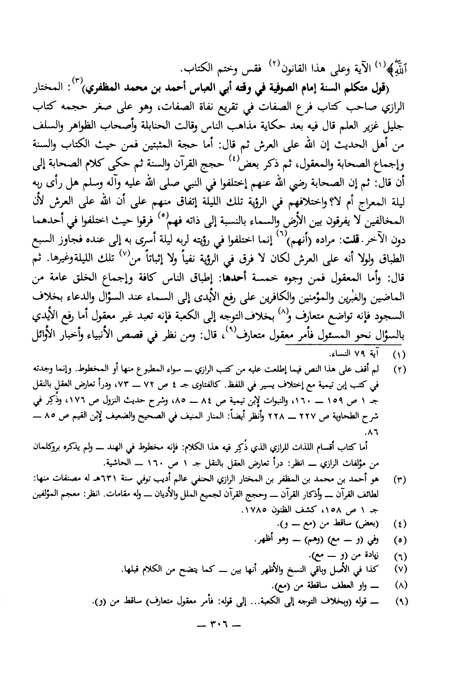 (قَوْلُ مُتَكَلِّمِ السُّنَّةِ إِمَامِ الصُّوفِيَّةِ فِي وَقْتِهِ أَبِي الْعَبَّاسِ أَحْمَدَ بْنِ مُحَمَّدٍ الْمُظَفَّرِيِّ) : الْمُخْتَارِ الرَّازِيِّ صَاحِبِ كِتَابِ فَرْعِ الصِّفَاتِ فِي تَقْرِيعِ نُفَاةِ الصِّفَاتِ، وَهُوَ عَلَى صِغَرِ حَجْمِهِ كِتَابٌ جَلِيلٌ غَزِيرُ الْعِلْمِ قَالَ فِيهِ بَعْدَ حِكَايَةِ مَذَاهِبِ النَّاسِ: وَقَالَتِ الْحَنَابِلَةُ وَأَصْحَابُ الظَّوَاهِرِ وَالسَّلَفُ مِنْ أَهْلِ الْحَدِيثِ: إِنَّ اللَّهَ عَلَى الْعَرْشِ ثُمَّ قَالَ: أَمَّا حُجَّةُ الْمُثْبِتِينَ فَمِنْ حَيْثُ الْكِتَابُ وَالسُّنَّةُ وَإِجْمَاعُ الصَّحَابَةِ وَالْمَعْقُولُ، ثُمَّ ذَكَرَ حُجَجَ الْقُرْآنِ وَالسُّنَّةِ ثُمَّ حَكَى كَلَامَ الصَّحَابَةِ إِلَى أَنْ قَالَ: ثُمَّ إِنَّ الصَّحَابَةَ رَضِيَ اللَّهُ عَنْهُمُ اخْتَلَفُوا فِي النَّبِيِّ صَلَّى اللَّهُ عَلَيْهِ وَآلِهِ وَسَلَّمَ هَلْ رَأَى رَبَّهُ لَيْلَةَ الْمِعْرَاجِ أَمْ لَا؟ وَاخْتِلَافُهُمْ فِي الرُّؤْيَةِ تِلْكَ اللَّيْلَةَ اتِّفَاقٌ مِنْهُمْ عَلَى أَنَّ اللَّهَ عَلَى الْعَرْشِ لِأَنَّ الْمُخَالِفِينَ لَا يُفَرِّقُونَ بَيْنَ الْأَرْضِ وَالسَّمَاءِ بِالنِّسْبَةِ إِلَى ذَاتِهِ فَهُمْ فَرَّقُوا حَيْثُ اخْتَلَفُوا فِي أَحَدِهِمَا دُونَ الْآخَرِ. قُلْتُ: مُرَادُهُ (أَنَّهُمْ) إِنَّمَا اخْتَلَفُوا فِي رُؤْيَتِهِ لِرَبِّهِ لَيْلَةَ أَسْرَى بِهِ إِلَى عِنْدِهِ فَجَاوَزَ السَّبْعَ الطِّبَاقَ، وَلَوْلَا أَنَّهُ عَلَى الْعَرْشِ لَكَانَ لَا فَرْقَ فِي الرُّؤْيَةِ نَفْيًا وَلَا إِثْبَاتًا فِي تِلْكَ اللَّيْلَةِ وَغَيْرِهَا. ثُمَّ قَالَ: وَأَمَّا الْمَعْقُولُ فَمِنْ وُجُوهٍ خَمْسَةٍ: أَحُدُهَا: إِطْبَاقُ النَّاسِ كَافَّةً وَإِجْمَاعُ الْخَلْقِ عَامَّةً مِنَ الْمَاضِينَ وَالْغَابِرِينَ وَالْمُؤْمِنِينَ وَالْكَافِرِينَ عَلَى رَفْعِ الْأَيْدِي إِلَى السَّمَاءِ عِنْدَ السُّؤَالِ وَالدُّعَاءِ بِخِلَافِ السُّجُودِ، فَإِنَّهُ تَوَاضُعٌ مُتَعَارَفٌ، وَبِخِلَافِ التَّوَجُّهِ إِلَى الْكَعْبَةِ فَإِنَّهُ تَعَبُّدٌ غَيْرُ مَعْقُولٍ، أَمَّا رَفْعُ الْأَيْدِي بِالسُّؤَالِ نَحْوَ الْمَسْئُولِ فَأَمْرٌ مَعْقُولٌ مُتَعَارَفٌ، قَالَ: وَمَنْ نَظَرَ فِي قَصَصِ الْأَنْبِيَاءِ وَأَخْبَارِ الْأَوَائِلِ