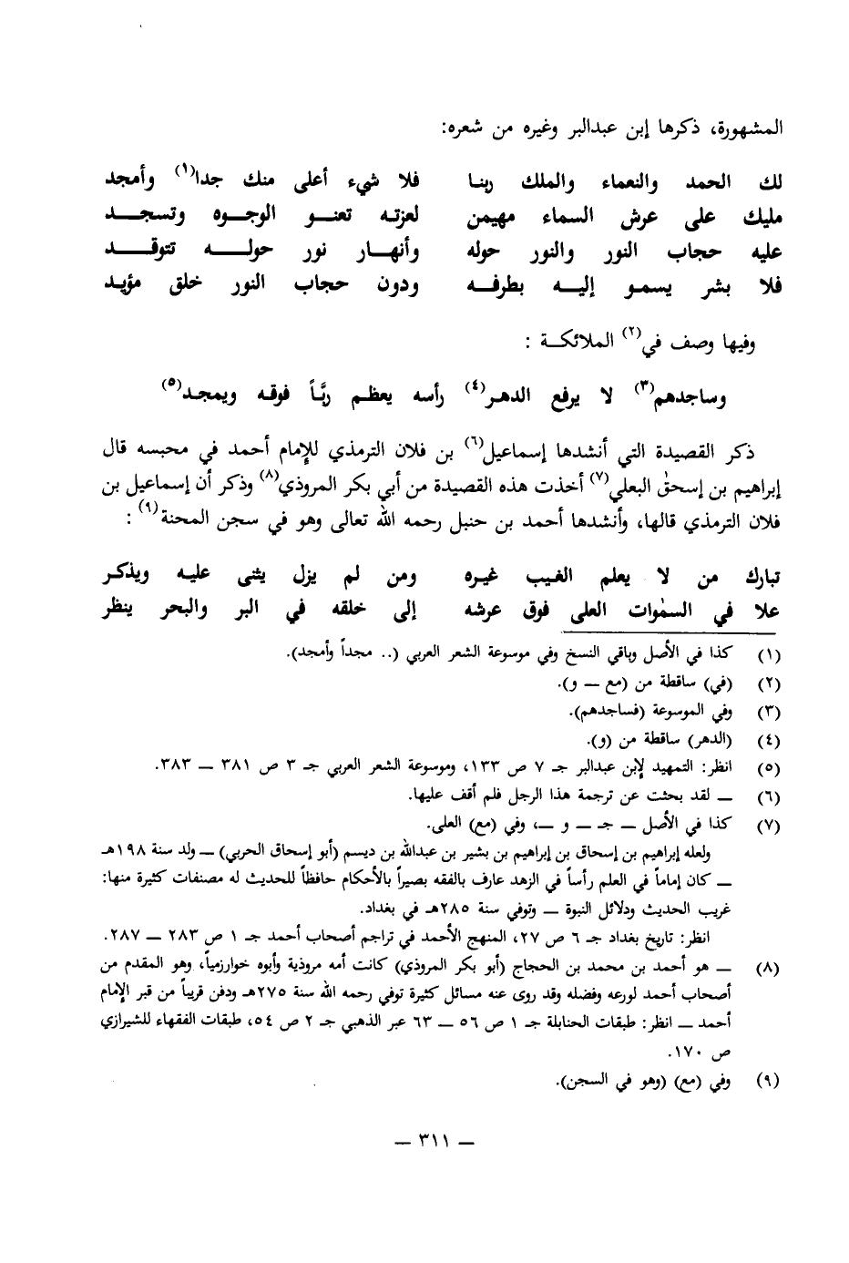 ِ قَالَ إِبْرَاهِيمُ بْنُ إِسْحَاقَ الْبَعْلِيُّ: أَخَذْتُ هَذِهِ الْقَصِيدَةَ مِنْ أَبِي بَكْرٍ الْمَرُّوذِيِّ وَذَكَرَ أَنَّ إِسْمَاعِيلَ بْنَ فُلَانٍ التِّرْمِذِيَّ قَالَهَا، وَأَنْشَدَهَا أَحْمَدَ بْنَ حَنْبَلٍ رَحِمَهُ اللَّهُ تَعَالَى وَهُوَ فِي سِجْنِ الْمِحْنَةِ: