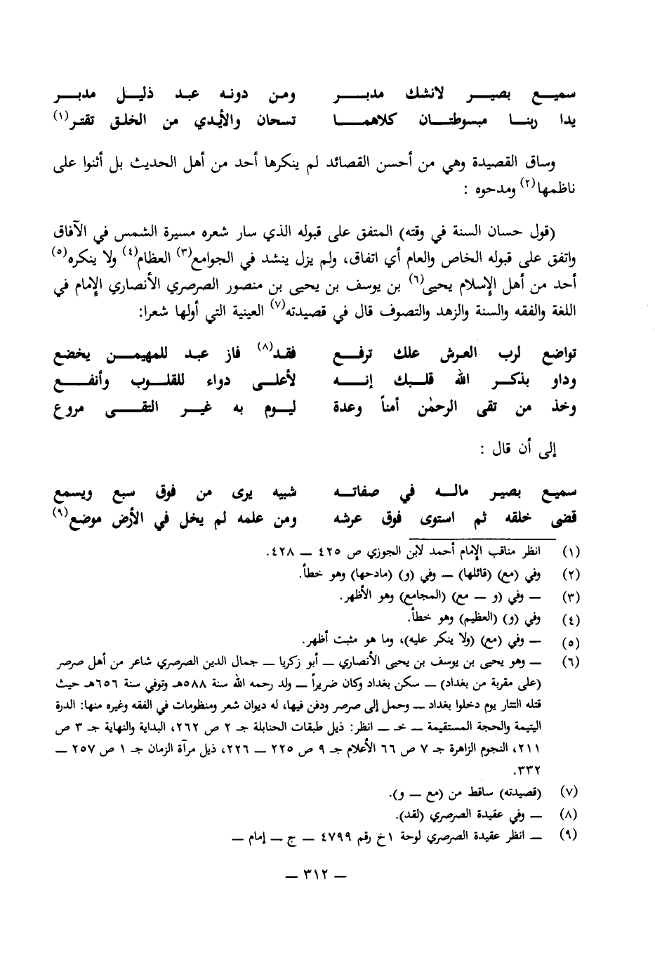 (قَوْلُ حَسَّانَ السُّنَّةِ فِي وَقْتِهِ) الْمُتَّفَقِ عَلَى قَبُولِهِ، الَّذِي سَارَ شِعْرُهُ مَسِيرَةَ الشَّمْسِ فِي الْآفَاقِ، وَاتَّفَقَ عَلَى قَبُولِهِ الْخَاصُّ وَالْعَامُّ أَيَّ اتِّفَاقٍ، وَلَمْ يَزَلْ يُنْشَدُ فِي الْجَوَامِعِ الْعِظَامِ وَلَا يُنْكِرُهُ أَحَدٌ مِنْ أَهْلِ الْإِسْلَامِ يَحْيَى بْنِ يُوسُفَ بْنِ يَحْيَى بْنِ مَنْصُورٍ الصَّرْصَرِيِّ الْأَنْصَارِيِّ الْإِمَامِ فِي اللُّغَةِ وَالْفِقَهِ وَالسُّنَّةِ وَالزُّهْدِ وَالتَّصَوُّفِ قَالَ فِي قَصِيدَتِهِ الْعَيْنِيَّةِ الَّتِي أَوُّلَهَا شِعْرًا: