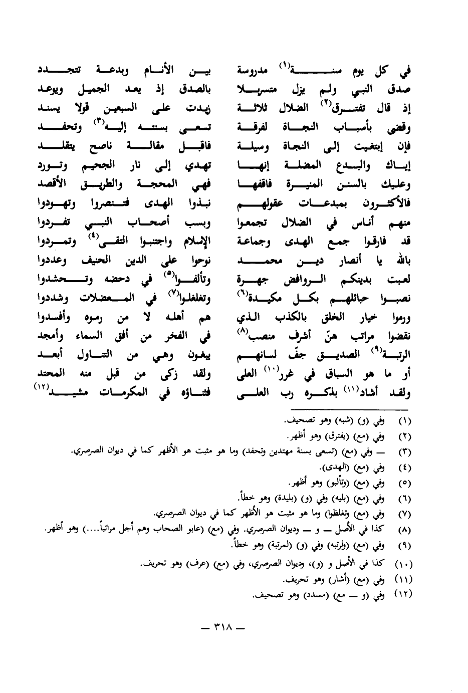 صَدَقَ النَّبِيُّ وَلَمْ يَزَلْ مُتَسَرْبِلًا ... بِالصِّدْقِ إِذْ يَعِدُ الْجَمِيلَ وَيُوعِدُ