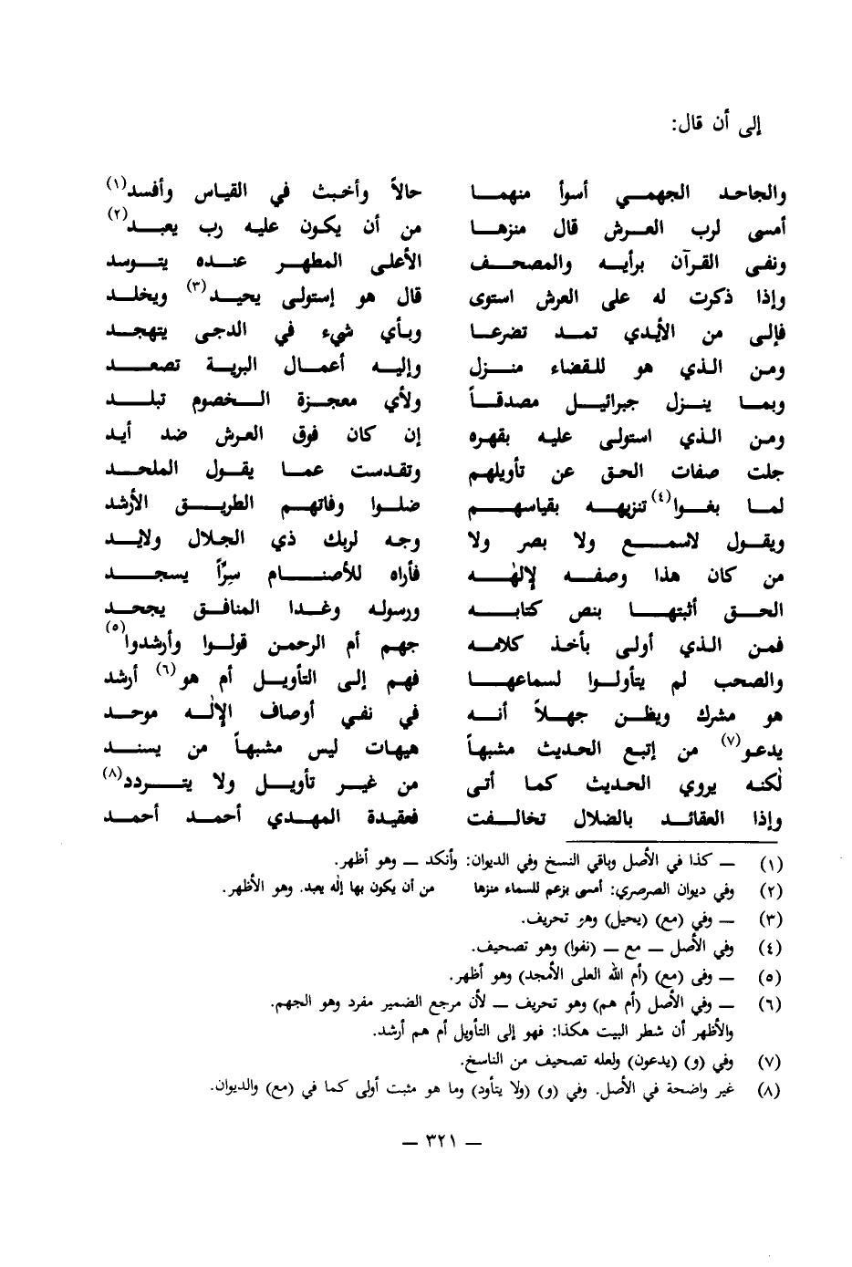 وَإِذَا ذَكَرْتَ لَهُ عَلَى الْعَرْشِ اسْتَوَى ... قَالَ هُوَ اسْتَوْلَى يَحِيدُ وَيَخْلُدُ