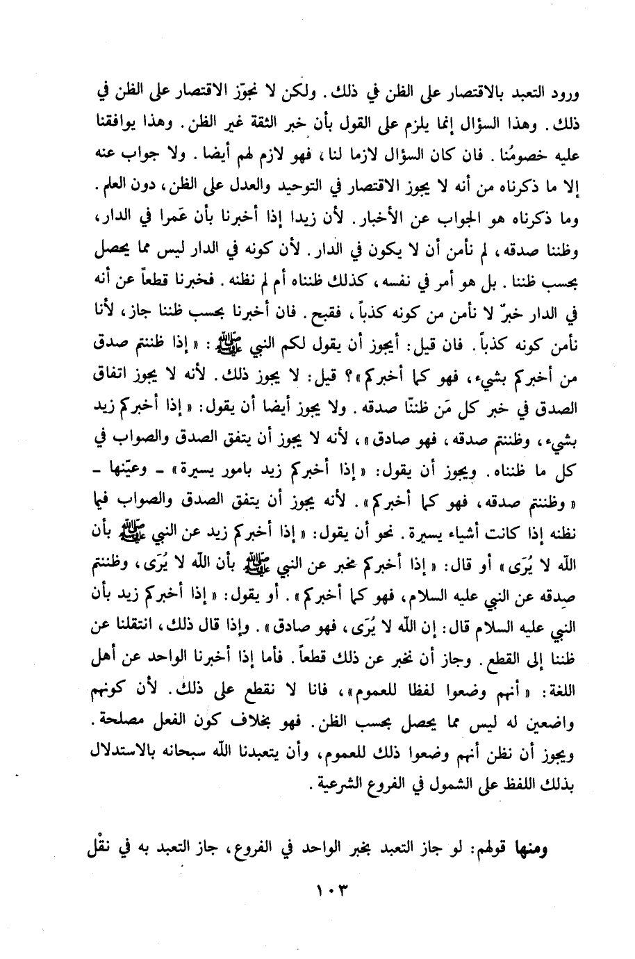 وُرُود التَّعَبُّد بالاقتصار على الظَّن فِي ذَلِك وَلَكِن لَا نجوز الِاقْتِصَار على الظَّن فِي ذَلِك وَهَذَا السُّؤَال إِنَّمَا يلْزم على القَوْل بِأَن خبر الثِّقَة غير الظَّن وَهَذَا يوافقنا عَلَيْهِ خصومنا فان كَانَ السُّؤَال لَازِما لنا فَهُوَ لَازم لَهُم أَيْضا وَلَا جَوَاب عَنهُ إِلَّا مَا ذَكرْنَاهُ من أَنه لَا يجوز الِاقْتِصَار فِي التَّوْحِيد وَالْعدْل على الظَّن دون الْعلم وَمَا ذَكرْنَاهُ هُوَ الْجَواب عَن الْأَخْبَار لِأَن زيدا إِذا أخبرنَا بِأَن عمرا فِي الدَّار وظننا صدقه لم نَأْمَن أَن لَا يكون فِي الدَّار لِأَنَّهُ كَونه فِي الدَّار لَيْسَ مِمَّا يحصل بِحَسب ظننا بل هُوَ أَمر فِي نَفسه كَذَلِك ظنناه أم لم نظنه فخبرنا قطعا عَن أَنه فِي الدَّار خبر لَا نَأْمَن من كَونه كذبا فقبح فان أخبرنَا بِحَسب ظننا جَازَ لأَنا نَأْمَن كَونه كذبا فان قيل ايجوز أَن يَقُول لكم النَّبِي صلى الله عَلَيْهِ وَسلم إِذا ظننتم صدق من أخْبركُم بِشَيْء فَهُوَ كَمَا أخْبركُم قيل لَا يجوز ذَلِك لِأَنَّهُ لَا يجوز اتِّفَاق الصدْق فِي خبر كل من ظننا صدقه وَلَا يجوز أَيْضا أَن يَقُول إِذا أخْبركُم زيد بِشَيْء وظننتم صدقه فَهُوَ صَادِق لِأَنَّهُ لَا يجوز أَن يتَّفق الصدْق وَالصَّوَاب فِي كل مَا ظنناه وَيجوز أَن يَقُول إِذا أخْبركُم زيد بِأُمُور يسيرَة وعينها وظننتم صدقه فَهُوَ كَمَا أخْبركُم لِأَنَّهُ يجوز أَن يتَّفق الصدْق وَالصَّوَاب فِيمَا نظنه إِذا كَانَت أَشْيَاء يسيرَة نَحْو أَن يَقُول إِذا أخْبركُم زيد عَن النَّبِي صلى الله عَلَيْهِ وَسلم بِأَن الله لَا يرى أَو قَالَ إِذا أخْبركُم مخبر عَن النَّبِي صلى الله عَلَيْهِ وَسلم بِأَن الله لَا يرى وظننتم صدقه عَن النَّبِي عَلَيْهِ السَّلَام فَهُوَ كَمَا أخْبركُم أَو يَقُول إِذا أخْبركُم زيد بِأَن النَّبِي عَلَيْهِ السَّلَام قَالَ إِن الله لَا يرى فَهُوَ صَادِق وَإِذا قَالَ ذَلِك انتقلنا عَن ظننا إِلَى الْقطع وَجَاز أَن نخبر عَن ذَلِك قطعا فَأَما إِذا أخبرنَا الْوَاحِد عَن أهل اللُّغَة أَنهم وضعُوا لفظا للْعُمُوم فانا لَا نقطع على ذَلِك لِأَن كَونهم واضعين لَهُ لَيْسَ مِمَّا يحصل بِحَسب الظَّن فَهُوَ بِخِلَاف كَون الْفِعْل مصلحَة وَيجوز أَن نظن أَنهم وضعُوا ذَلِك للْعُمُوم وَأَن يتعبدنا الله سُبْحَانَهُ بالاستدلال بذلك اللَّفْظ على الشُّمُول فِي الْفُرُوع الشَّرْعِيَّة
