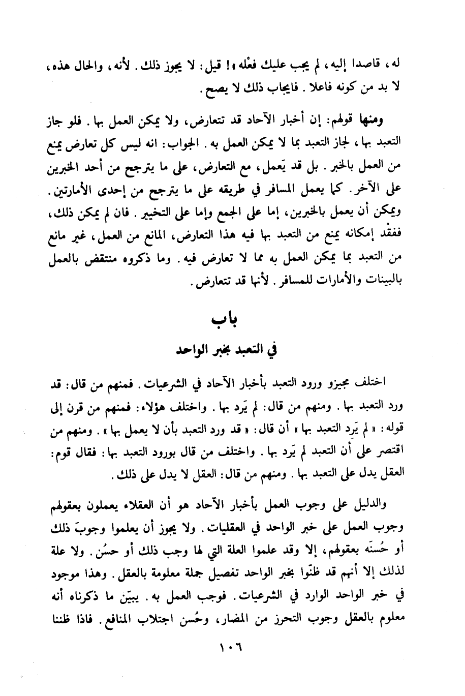 وَمِنْهَا قَوْلهم إِن أَخْبَار الْآحَاد قد تتعارض وَلَا يُمكن الْعَمَل بهَا فَلَو جَازَ التَّعَبُّد بهَا لجَاز التَّعَبُّد بِمَا لَا يُمكن الْعَمَل بِهِ الْجَواب أَنه لَيْسَ كل تعَارض يمْنَع من الْعَمَل بالْخبر بل قد يعْمل مَعَ التَّعَارُض على مَا يتَرَجَّح من أحد الْخَبَرَيْنِ على الآخر كَمَا يعْمل الْمُسَافِر فِي طَرِيقه على مَا يتَرَجَّح من إِحْدَى الأمارتين وَيُمكن أَن يعْمل بالخبرين إِمَّا على الْجمع وَإِمَّا على التَّخْيِير فان لم يُمكن ذَلِك ففقد إِمْكَانه يمْنَع من التَّعَبُّد بهَا فِيهِ هَذَا التَّعَارُض الْمَانِع من الْعَمَل غير مَانع من التَّعَبُّد بِمَا يُمكن الْعَمَل بِهِ مِمَّا لَا تعَارض فِيهِ وَمَا ذَكرُوهُ منتقض بِالْعَمَلِ بِالْبَيِّنَاتِ والأمارات للْمُسَافِر لِأَنَّهَا قد تتعارض - صَلَّى اللَّهُ عَلَيْهِ وَسَلَّم َ - بَاب فِي التَّعَبُّد بِخَبَر الْوَاحِد - صَلَّى اللَّهُ عَلَيْهِ وَسَلَّم َ -