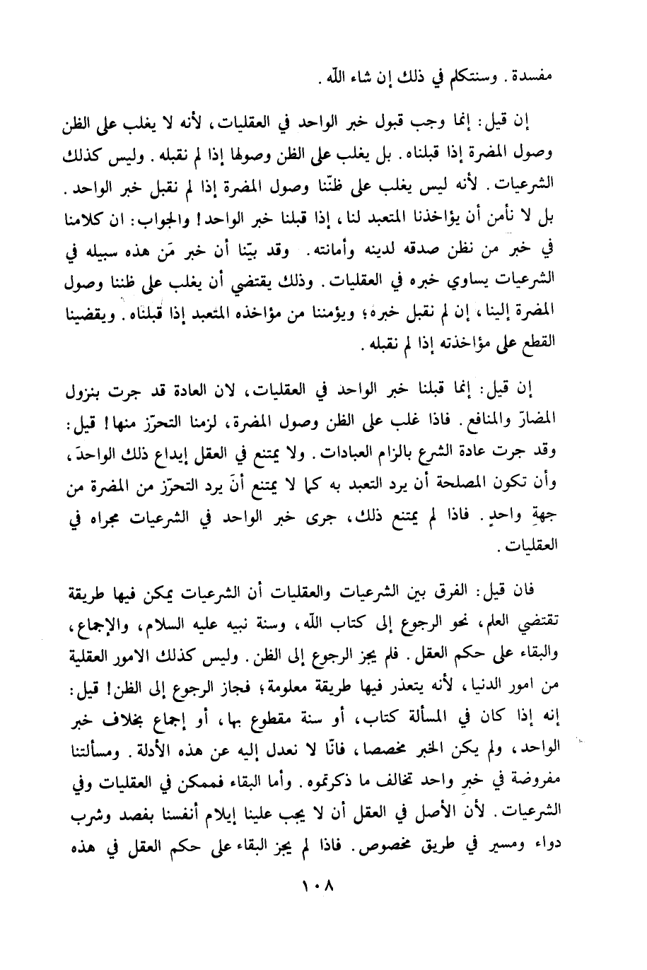 إِن قيل إِنَّمَا وَجب قبُول خبر الْوَاحِد فِي العقليات لِأَنَّهُ لَا يغلب على الظَّن وُصُول الْمضرَّة إِذا قبلناه بل يغلب على الظَّن وصولها إِذا لم نقبله وَلَيْسَ كَذَلِك الشرعيات لِأَنَّهُ لَيْسَ يغلب على ظننا وُصُول الْمضرَّة إِذا لم نقبل خبر الْوَاحِد بل لَا نَأْمَن أَن يؤاخذنا المتعبد لنا إِذا قبلنَا خبر الْوَاحِد وَالْجَوَاب ان كلامنا فِي خبر من نظن صدقه لدينِهِ وأمانته وَقد بَينا أَن خبر من هَذِه سَبيله فِي الشرعيات يُسَاوِي خَبره فِي العقليات وَذَلِكَ يَقْتَضِي أَن يغلب على ظننا وُصُول الْمضرَّة إِلَيْنَا إِن لم نقبل خَبره ويؤمننا من مُؤَاخذَة المتعبد إِذا قبلناه ويقضينا الْقطع على مؤاخذته إِذا لم نقبله