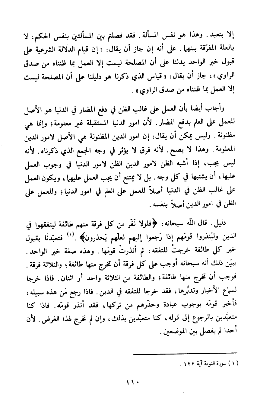 دَلِيل قَالَ الله سُبْحَانَهُ {فلولا نفر من كل فرقة مِنْهُم طَائِفَة ليتفقهوا فِي الدّين ولينذروا قَومهمْ إِذا رجعُوا إِلَيْهِم لَعَلَّهُم يحذرون} فتعبدنا بِقبُول خبر كل طَائِفَة خرجت للتفقه ثمَّ أنذرت قَومهَا وَهَذِه صفة خبر الْوَاحِد يبين ذَلِك أَنه سُبْحَانَهُ أوجب على كل فرقة أَن تخرج مِنْهَا طَائِفَة وَالثَّلَاثَة فرقة فَوَجَبَ أَن تخرج مِنْهَا طَائِفَة والطائفة من الثَّلَاثَة وَاحِد أَو اثْنَان فاذا خرجا لسَمَاع الْأَخْبَار وتدبرها فقد خرجا للتفقه فِي الدّين فاذا رَجَعَ من هَذِه سَبيله فَأخْبر قومه بِوُجُوب عبَادَة وحذرهم من تَركهَا فقد أنذر قومه فاذا كُنَّا متعبدين بِالرُّجُوعِ إِلَى قَوْله كُنَّا متعبدين بذلك وَإِن لم نخرج لهَذَا الْغَرَض لِأَن أحدا لم يفصل بَين الْمَوْضِعَيْنِ
