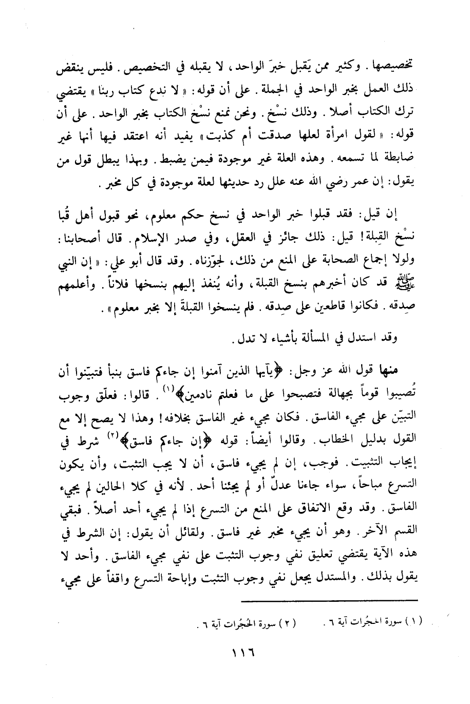 تخصيصها وَكثير مِمَّن يقبل خبر الْوَاحِد لَا يقبله فِي التَّخْصِيص فَلَيْسَ ينقص ذَلِك الْعَمَل بِخَبَر الْوَاحِد فِي الْجُمْلَة على أَن قَوْله لَا نَدع كتاب رَبنَا يَقْتَضِي ترك الْكتاب أصلا وَذَلِكَ نسخ وَنحن نمْنَع نسخ الْكتاب بِخَبَر الْوَاحِد على أَن قَوْله لقَوْل امْرَأَة لَعَلَّهَا صدقت أم كذبت يُفِيد أَنه اعْتقد فِيهَا أَنَّهَا غير ضابطة لما تسمعه وَهَذِه الْعلَّة غير مَوْجُودَة فِيمَن يضْبط وَبِهَذَا يبطل قَول من يَقُول إِن عمر رَضِي الله عَنهُ علل رد حَدِيثهَا لعِلَّة مَوْجُودَة فِي كل مخبر