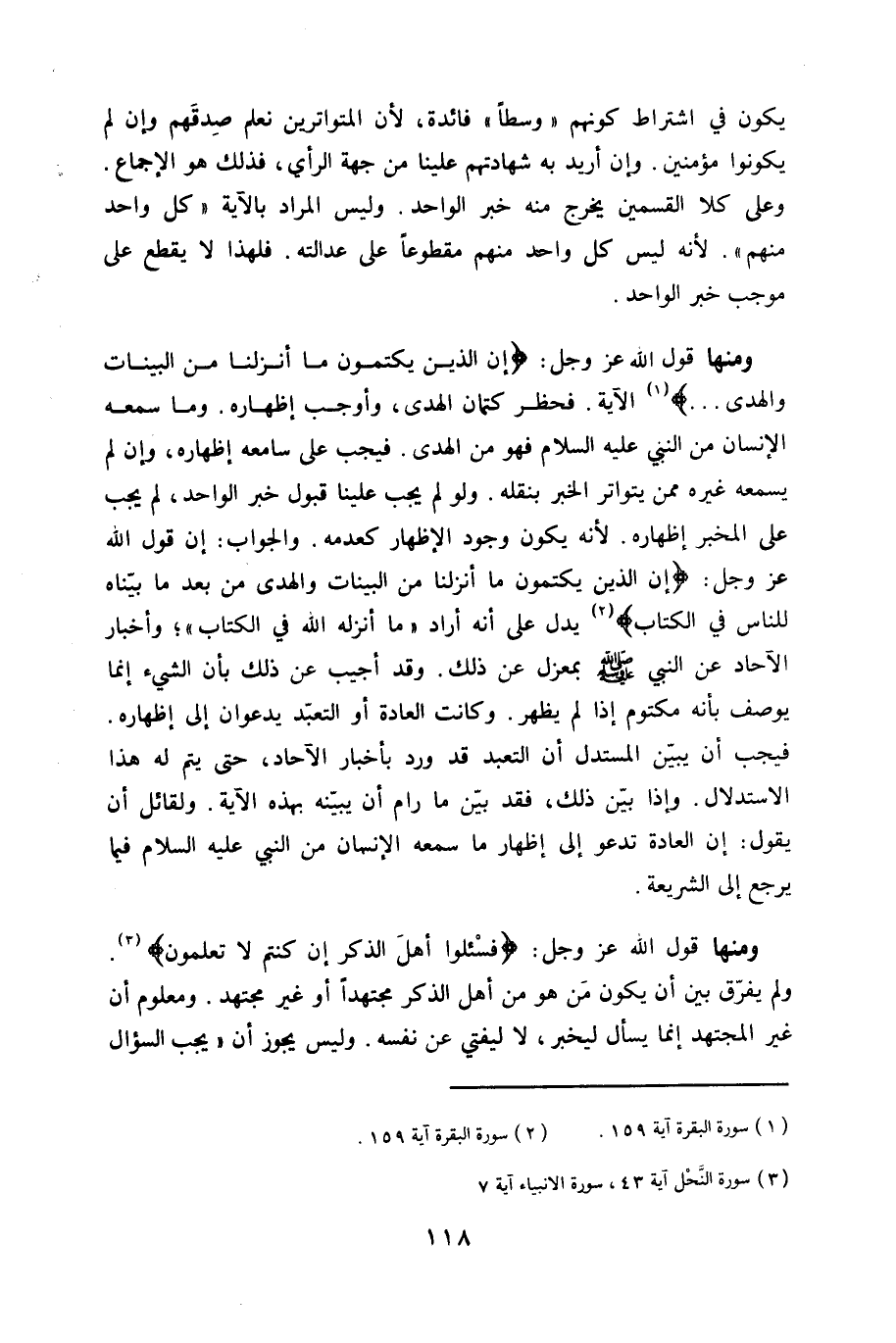 وَمِنْهَا قَول الله عز وَجل {إِن الَّذين يكتمون مَا أنزلنَا من الْبَينَات وَالْهدى} الْآيَة فحظر كتمان الْهدى وَأوجب إِظْهَاره وَمَا سَمعه الْإِنْسَان من النَّبِي عَلَيْهِ السَّلَام فَهُوَ من الْهدى فَيجب على سامعه إِظْهَاره وَإِن لم يسمعهُ غَيره مِمَّن يتواتر الْخَبَر بنقله وَلَو لم يجب علينا قبُول خبر الْوَاحِد لم يجب على الْمخبر إِظْهَاره لِأَنَّهُ يكون وجود الْإِظْهَار كَعَدَمِهِ وَالْجَوَاب إِن قَول الله عز وَجل {إِن الَّذين يكتمون مَا أنزلنَا من الْبَينَات وَالْهدى من بعد مَا بَيناهُ للنَّاس فِي الْكتاب} يدل على أَنه أَرَادَ مَا أنزلهُ الله فِي الْكتاب وأخبار الْآحَاد عَن النَّبِي صلى الله عَلَيْهِ وَسلم بمعزل عَن ذَلِك وَقد أُجِيب عَن ذَلِك بِأَن الشَّيْء إِنَّمَا يُوصف بِأَنَّهُ مَكْتُوم إِذا لم يظْهر وَكَانَت الْعَادة أَو التَّعَبُّد يدعوان إِلَى إِظْهَاره فَيجب أَن يبين الْمُسْتَدلّ أَن التَّعَبُّد قد ورد بأخبار الْآحَاد حَتَّى يتم لَهُ هَذَا الِاسْتِدْلَال وَإِذا بَين ذَلِك فقد بَين مَا رام أَن يُبينهُ بِهَذِهِ الْآيَة وَلقَائِل أَن يَقُول إِن الْعَادة تَدْعُو إِلَى إِظْهَار مَا سَمعه الْإِنْسَان من النَّبِي عَلَيْهِ السَّلَام فِيمَا يرجع إِلَى الشَّرِيعَة