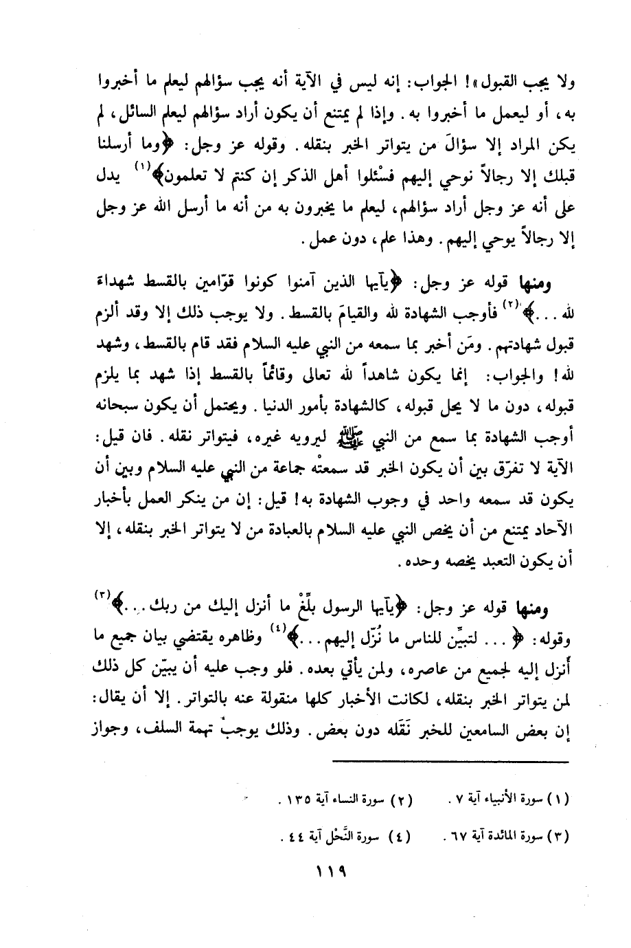 وَلَا يجب الْقبُول الْجَواب إِنَّه لَيْسَ فِي الاية أَنه يجب سُؤَالهمْ ليعلم مَا أخبروا بِهِ ليعْمَل مَا أخبروا بِهِ وَإِذا لم يمْتَنع أَن يكون اراد سُؤَالهمْ ليعلم السَّائِل لم يكن المُرَاد إِلَّا سُؤال من يتواتر الْخَبَر بنقله وَقَوله عز وَجل {وَمَا أرسلنَا من قبلك إِلَّا رجَالًا نوحي إِلَيْهِم فاسألوا أهل الذّكر إِن كُنْتُم لَا تعلمُونَ} يدل على أَنه عز وَجل أَرَادَ سُؤَالهمْ ليعلم مَا يخبرون بِهِ من أَنه أرسل الله عز وَجل إِلَّا رجَالًا يوحي إِلَيْهِم وَهَذَا علم دون عمل