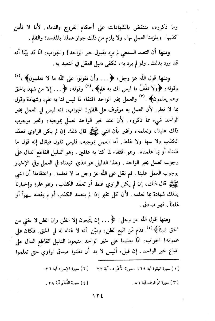 وَمِنْهَا قَول الله عز وَجل {وَأَن تَقولُوا على الله مَا لَا تعلمُونَ} وَقَوله {وَلَا تقف مَا لَيْسَ لَك بِهِ علم} وَقَوله {إِلَّا من شهد بِالْحَقِّ وهم يعلمُونَ} وَالْعَمَل بِخَبَر الْوَاحِد اقتفاء لما لَيْسَ لنا بِهِ علم وَشَهَادَة وَقَول بِمَا لَا نعلم لِأَن الْعَمَل بِهِ مَوْقُوف على الظَّن الْجَواب أَنه لَيْسَ فِي الْعَمَل بِخَبَر الْوَاحِد شَيْء مِمَّا ذَكرُوهُ لِأَن عِنْد خبر الْوَاحِد نعمل بِمُوجبِه ونخبر بِوُجُوب ذَلِك علينا ونعلمه ونخبر بِأَن النَّبِي صلى الله عَلَيْهِ وَسلم قَالَ ذَلِك إِن لم يكن الرَّاوِي تعمد الْكَذِب وَلَا سَهَا وَلَا غلط أما الْعَمَل بِمُوجبِه فَلَيْسَ نقُول فَيُقَال إِنَّه قَول مَا ظنناه أَو بِمَا علمناه وَهُوَ اقتفاء لما كُنَّا بِهِ عَالمين وَهُوَ الدَّلِيل الْقَاطِع الدَّال على وجوب الْعَمَل بِخَبَر الْوَاحِد وَهَذَا الدَّلِيل هُوَ الَّذِي اتبعناه فِي الْعَمَل وَفِي الْإِخْبَار بِوُجُوب الْعَمَل علينا فَلم نقل على الله عز وَجل مَا لَا نعلمهُ واعتقادنا أَن النَّبِي صلى الله عَلَيْهِ وَسلم قَالَ ذَلِك إِن لم يكن الرَّاوِي غلط أَو تعمد الْكَذِب وَهُوَ علم وإخبارنا بذلك شَهَادَة بِمَا نعلمهُ لِأَن كل مخبر إِذا لم يتَعَمَّد الْكَذِب وَلم يَفْعَله سَهوا أَو غَلطا فَهُوَ صَادِق