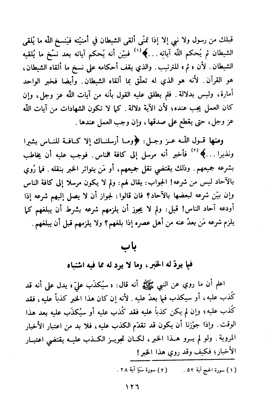 فَبين أَنه يحكم آيَاته بعد نسخ مَا يلقيه الشَّيْطَان لِأَن ثمَّ للتَّرْتِيب وَالَّذِي يقف أَحْكَامه على نسخ مَا القاه الشَّيْطَان هُوَ الْقُرْآن لِأَنَّهُ هُوَ الَّذِي لَهُ تعلق بِمَا أَلْقَاهُ الشَّيْطَان وَأَيْضًا فخبر الْوَاحِد امارة وَلَيْسَ بِدلَالَة فَلم يُطلق عَلَيْهِ القَوْل بِأَنَّهُ من آيَات الله عز وَجل وَإِن كَانَ الْعَمَل يجب عِنْده لِأَن الْآيَة دلَالَة كَمَا لَا تكون الشَّهَادَات من آيَات الله عز وَجل حَتَّى يقطع على صدقهَا وَإِن وَجب الْعَمَل عِنْدهَا