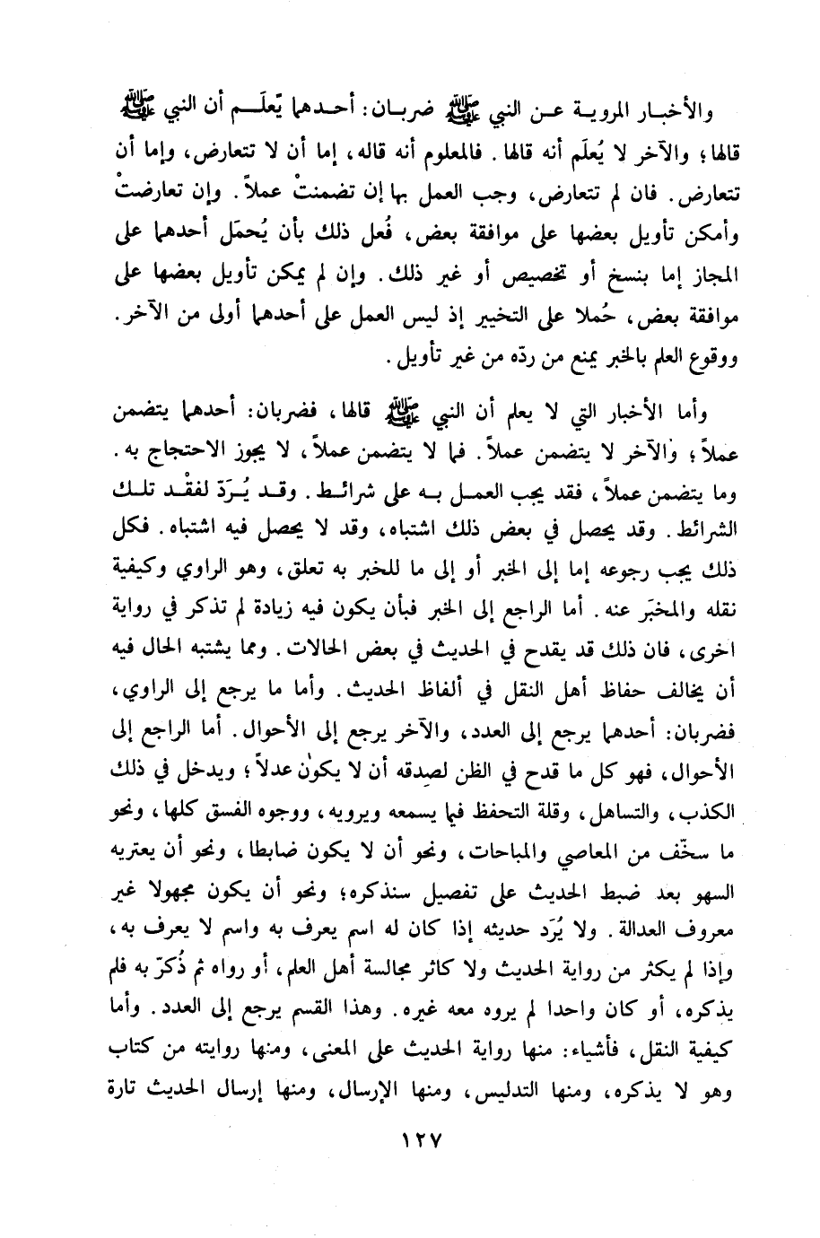 وَأما الْأَخْبَار الَّتِي لَا يعلم أَن النَّبِي صلى الله عَلَيْهِ وَسلم قَالَهَا فضربان أَحدهمَا يتَضَمَّن عملا وَالْآخر لَا يتَضَمَّن عملا فَمَا لَا يتَضَمَّن عملا لَا يجوز الِاحْتِجَاج بِهِ وَمَا يتَضَمَّن عملا فقد يجب الْعَمَل بِهِ على شَرَائِط وَقد يرد لفقد تِلْكَ الشَّرَائِط وَقد يحصل فِي بعض ذَلِك اشْتِبَاه وَقد لَا يحصل فِيهِ اشْتِبَاه فَكل ذَلِك يجب رُجُوعه إِمَّا إِلَى الْخَبَر أَو إِلَى مَا للْخَبَر بِهِ تعلق وَهُوَ الرَّاوِي وَكَيْفِيَّة نَقله والمخبر عَنهُ أما الرَّاجِع إِلَى الْخَبَر فبأن يكون فِيهِ زِيَادَة لم تذكر فِي رِوَايَة اخرى فان ذَلِك قد يقْدَح فِي الحَدِيث فِي بعض الْحَالَات وَمِمَّا يشْتَبه الْحَال فِيهِ أَن يُخَالف حفاظ أهل النَّقْل فِي أَلْفَاظ الحَدِيث وَأما مَا يرجع إِلَى الرَّاوِي فضربان أَحدهمَا يرجع إِلَى الْعدَد وَالْآخر يرجع إِلَى الْأَحْوَال أما الرَّاجِع إِلَى الْأَحْوَال فَهُوَ كل مَا قدح فِي الظَّن لصدقه أَن لَا يكون عدلا وَيدخل فِي ذَلِك الْكَذِب والتساهل وقله التحفظ فِيمَا يسمعهُ وَيَرْوِيه ووجوه الْفسق كلهَا وَنَحْو مَا سخف من الْمعاصِي والمباحات وَنَحْو أَن لَا يكون ضابطا وَنَحْو أَن يَعْتَرِيه السَّهْو بعد ضبط الحَدِيث على تَفْصِيل سَنذكرُهُ وَنَحْو أَن يكون مَجْهُولا غير مَعْرُوف الْعَدَالَة وَلَا يرد حَدِيثه إِذا كَانَ لَهُ اسْم يعرف بِهِ وَاسم لَا يعرف بِهِ وَإِذا لم يكثر من رِوَايَة الحَدِيث وَلَا كاثر مجالسة أهل الْعلم أَو رَوَاهُ ثمَّ ذكر بِهِ فَلم يذكرهُ اَوْ كَانَ وَاحِدًا لم يروه مَعَه غَيره وَهَذَا الْقسم يرجع إِلَى الْعدَد واما كَيْفيَّة النَّقْل فأشياء مِنْهَا رِوَايَة الحَدِيث على الْمَعْنى وَمِنْهَا رِوَايَته من كتاب وَهُوَ لَا يذكرهُ وَمِنْهَا التَّدْلِيس وَمِنْهَا الْإِرْسَال وَمِنْهَا إرْسَال الحَدِيث تَارَة