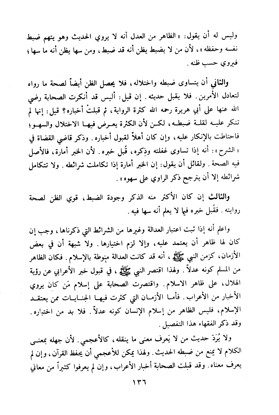 وَالثَّانِي أَن يتساوى ضَبطه واختلاله فَلَا يحصل الظَّن أَيْضا لصِحَّة مَا رَوَاهُ لتعادل الْأَمريْنِ فَلَا يقبل حَدِيثه إِن قيل أَلَيْسَ قد أنْكرت الصَّحَابَة رَضِي الله عَنْهَا على أبي هُرَيْرَة رَحمَه الله كَثْرَة الرِّوَايَة ثمَّ قبلت أخباره قيل إِنَّهَا لم تنكر عَلَيْهِ لقلَّة ضَبطه لَكِن لِأَن الْكَثْرَة يعرض فِيهَا الاختلال والسهو فاحتاطت بالإنكار عَلَيْهِ وَإِن كَانَ أَهلا لقبُول أخباره وَذكر قَاضِي الْقُضَاة فِي الشَّرْح أَنه إِذا تساوى غفلته وَذكره قبل خَبره لِأَن الْخَبَر أَمارَة فَالْأَصْل فِيهِ الصِّحَّة وَلقَائِل أَن يَقُول إِن الْخَبَر أَمارَة إِذا تكاملت شَرَائِطه وَلَا تتكامل شَرَائِطه إِلَّا أَن يتَرَجَّح ذكر الرَّاوِي على سَهْوه
