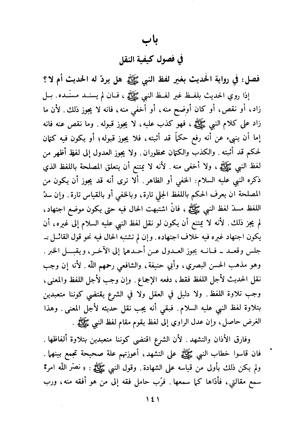 إِذا رُوِيَ الحَدِيث بِلَفْظ غير لفظ النَّبِي صلى الله عَلَيْهِ وَسلم فان لم يسند مُسْنده بل زَاد أَو نقص أَو كَانَ أوضح مِنْهُ أَو أُخْفِي مِنْهُ فانه لَا يجوز ذَلِك لِأَن مَا زَاد على كَلَام النَّبِي صلى الله عَلَيْهِ وَسلم فَهُوَ كذب عَلَيْهِ لَا يجوز قبُوله وَمَا نقص عَنهُ فانه إِمَّا أَن ينبىء عَن أَنه رفع حكما قد اثبته فَلَا يجوز قبُوله أَو يكون فِيهِ كتمان لحكم قد أثْبته وَالْكذب والكتمان محظوران وَلَا يجوز الْعُدُول إِلَى لفظ أظهر من لفظ النَّبِي صلى الله عَلَيْهِ وَسلم وَلَا أخْفى مِنْهُ لِأَنَّهُ لَا يمْتَنع ان يتَعَلَّق الْمصلحَة بِاللَّفْظِ الَّذِي ذكره النَّبِي عَلَيْهِ السَّلَام الْخَفي أَو الظَّاهِر أَلا ترى أَنه قد يجوز أَن يكون من الْمصلحَة أَن يعرف الحكم بِاللَّفْظِ الْجَلِيّ تَارَة وبالخفي أَو بِالْقِيَاسِ تَارَة وَإِن سد اللَّفْظ مسد لفظ النَّبِي صلى الله عَلَيْهِ وَسلم فان اشتبهت الْحَال فِيهِ حَتَّى يكون مَوضِع اجْتِهَاد لم يجز ذَلِك لِأَنَّهُ لَا يمْتَنع ان يكون لَو نقل لفظ النَّبِي عَلَيْهِ السَّلَام إِلَى غَيره أَن يكون اجْتِهَاد غَيره فِيهِ خلاف اجْتِهَاده وَإِن لم تشتبه الْحَال فِيهِ نَحْو قَول الْقَائِل جلس وَقعد فانه يجوز الْعُدُول عَن أَحدهمَا إِلَى الآخر وَيقبل الْخَبَر وَهُوَ مَذْهَب الْحسن الْبَصْرِيّ وَأبي حنيفَة وَالشَّافِعِيّ رَحِمهم الله لِأَنَّهُ إِن وَجب نقل الحَدِيث لأجل اللَّفْظ فَقَط دَفعه الْإِجْمَاع وَإِن وَجب لأجل اللَّفْظ وَالْمعْنَى وَجب تِلَاوَة اللَّفْظ وَلَا دَلِيل فِي الْعقل وَلَا فِي الشَّرْع يَقْتَضِي كوننا متعبدين بِتِلَاوَة لفظ النَّبِي عَلَيْهِ السَّلَام فَبَقيَ أَنه يجب نقل حَدِيثه لأجل الْمَعْنى وَهَذَا الْغَرَض حَاصِل وَإِن عدل الرَّاوِي إِلَى لفظ يقوم مقَام لفظ النَّبِي صلى الله عَلَيْهِ وَسلم
