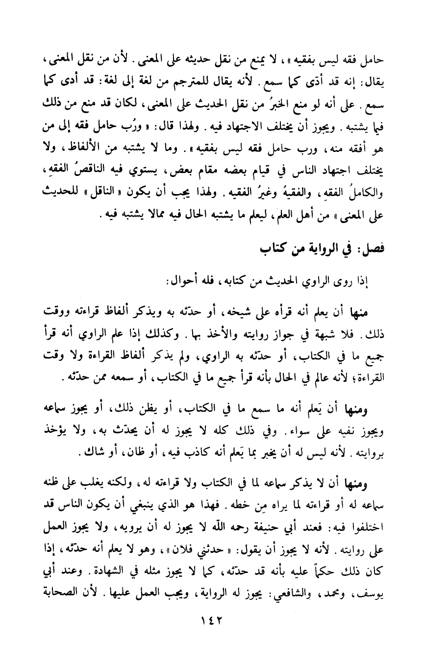 حَامِل فقه لَيْسَ بفقيه لَا يمْنَع من نقل حَدِيثه على الْمَعْنى لِأَن من نقل الْمَعْنى يُقَال إِنَّه قد أدّى كَمَا سمع لِأَنَّهُ يُقَال للمترجم من لُغَة إِلَى لُغَة قد أدّى كَمَا سمع على أَنه لَو منع الْخَبَر من نقل الحَدِيث على الْمَعْنى لَكَانَ قد منع من ذَلِك فِيمَا يشْتَبه وَيجوز أَن يخْتَلف الِاجْتِهَاد فِيهِ وَلِهَذَا قَالَ وَرب حَامِل فقه إِلَى من هُوَ أفقه مِنْهُ وَرب حَامِل فقه لَيْسَ بفقيه وَمَا لَا يشْتَبه من الْأَلْفَاظ وَلَا يخْتَلف اجْتِهَاد النَّاس فِي قيام بعضه مقَام بعض يَسْتَوِي فِيهِ النَّاقِص الْفِقْه والكامل الْفِقْه والفقيه وَغير الْفَقِيه وَلِهَذَا يجب أَن يكون النَّاقِل للْحَدِيث على الْمَعْنى من أهل الْعلم ليعلم مَا يشْتَبه الْحَال فِيهِ مِمَّا لَا يشْتَبه فِيهِ